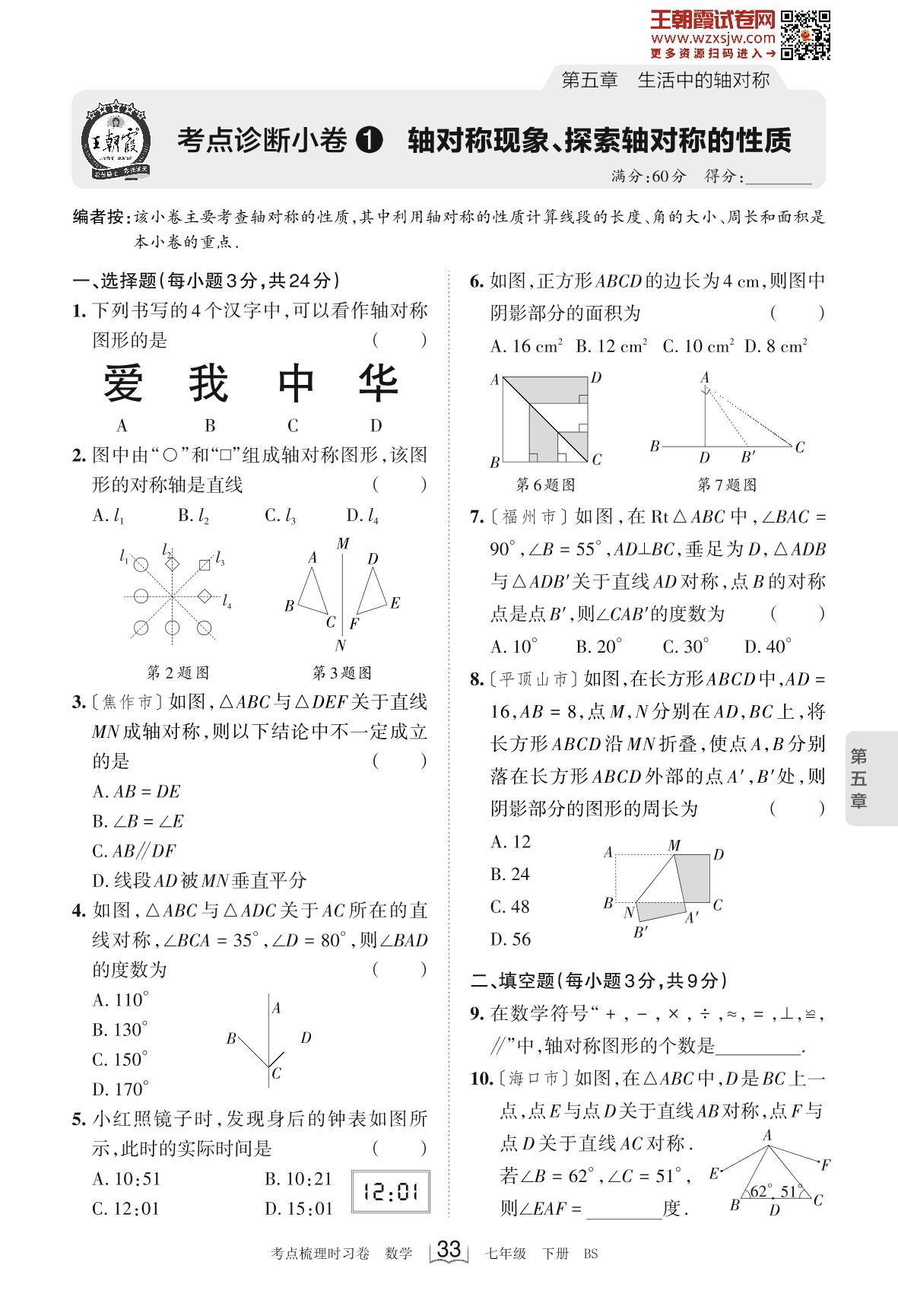 2023下册七年级数学北师版 第五章 考点诊断小卷1 轴对称现象、探索轴对称的性质