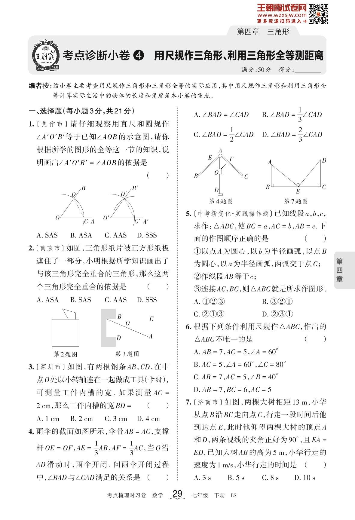 2023下册七年级数学北师版 第四章 考点诊断小卷4 用尺规作三角形、利用三角形全等测距离