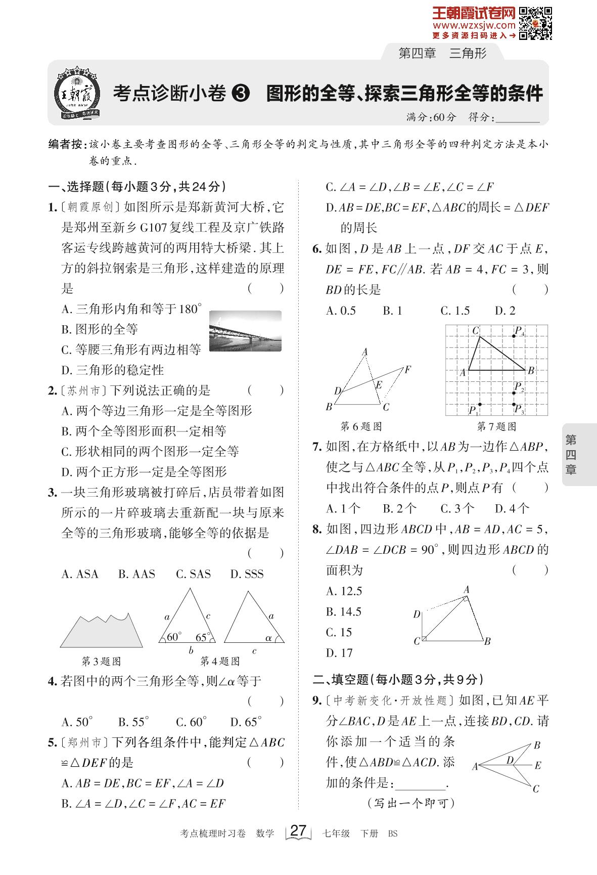 2023下册七年级数学北师版 第四章 考点诊断小卷3 图形的全等、探索三角形全等的条件