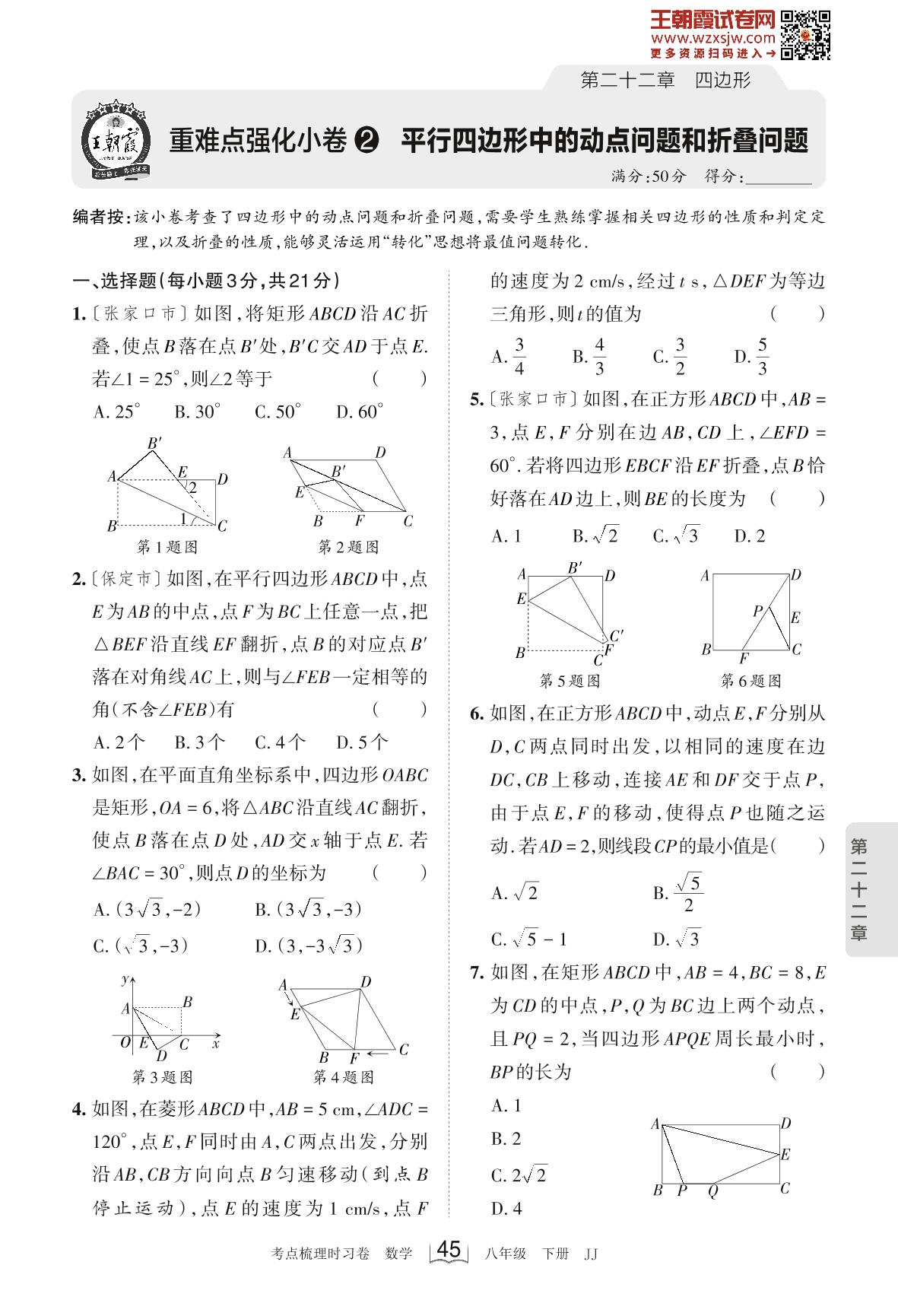 2023下册八年级数学冀教版 第二十二章 重难点强化小卷2 平行四边形中的动点问题和折叠问题