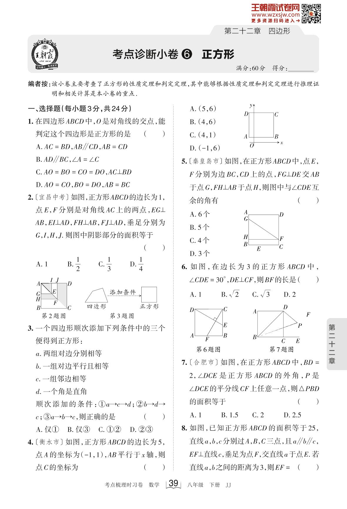 2023下册八年级数学冀教版 第二十二章 考点诊断小卷6 正方形