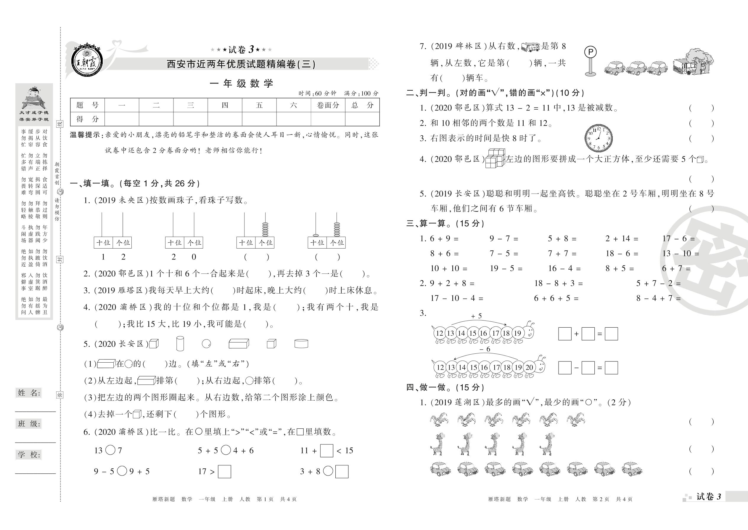 西安市近两年优质试题精编卷(三)一年级上册数学(人教版)【3】