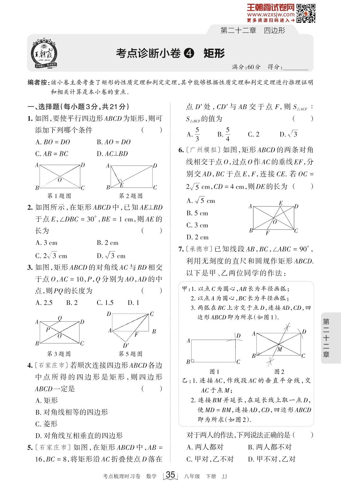 2023下册八年级数学冀教版 第二十二章 考点诊断小卷4 矩形