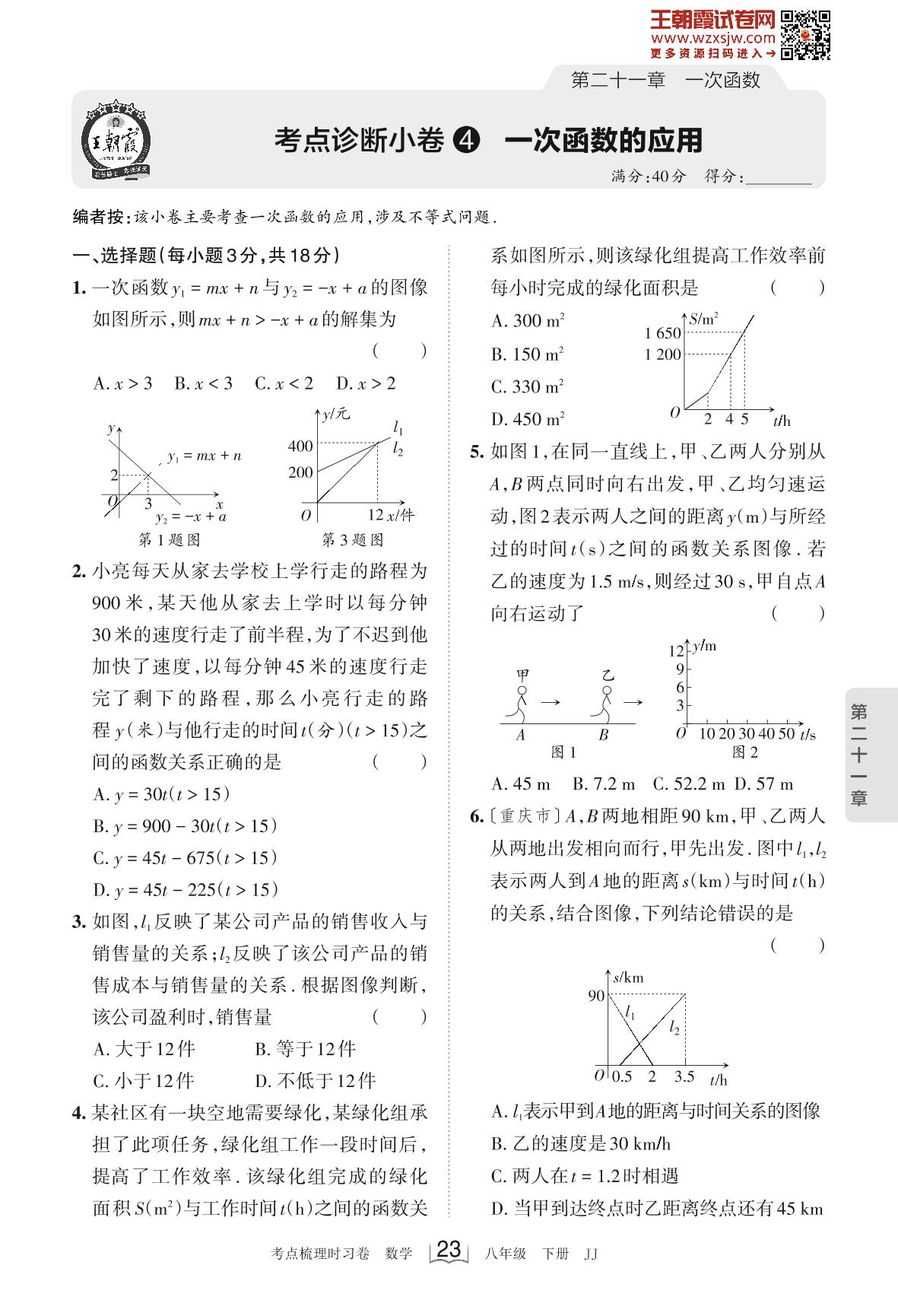 2023下册八年级数学冀教版 第二十一章 考点诊断小卷4 一次函数的应用