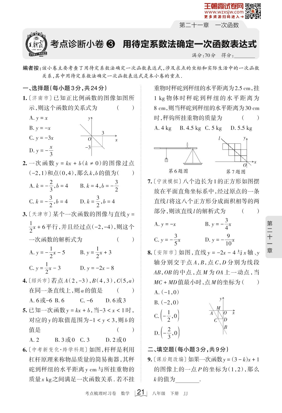 2023下册八年级数学冀教版 第二十一章 考点诊断小卷3 用待定系数法确定一次函数表达式