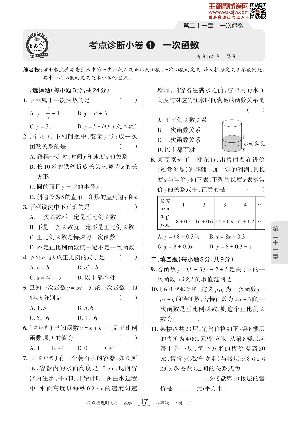2023下册八年级数学冀教版 第二十一章 考点诊断小卷1 一次函数