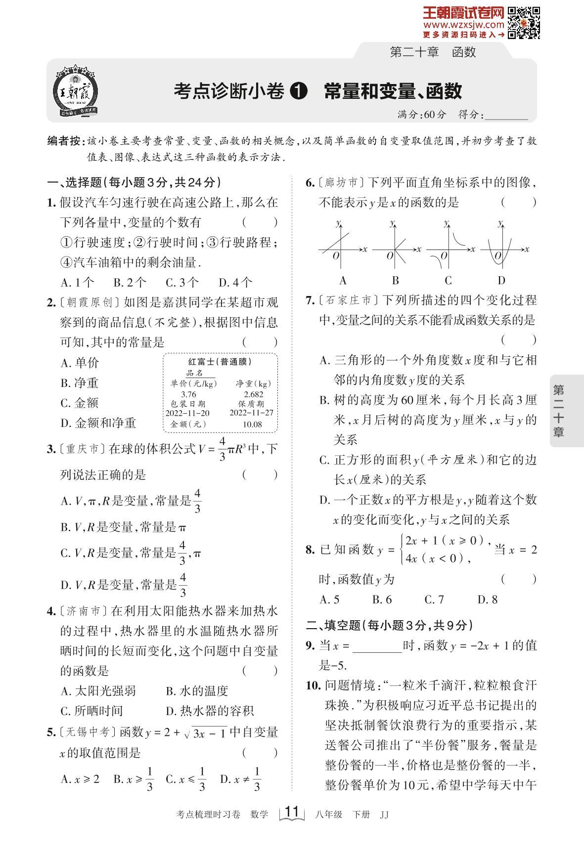 2023下册八年级数学冀教版 第二十章 考点诊断小卷1 常量和变量、函数