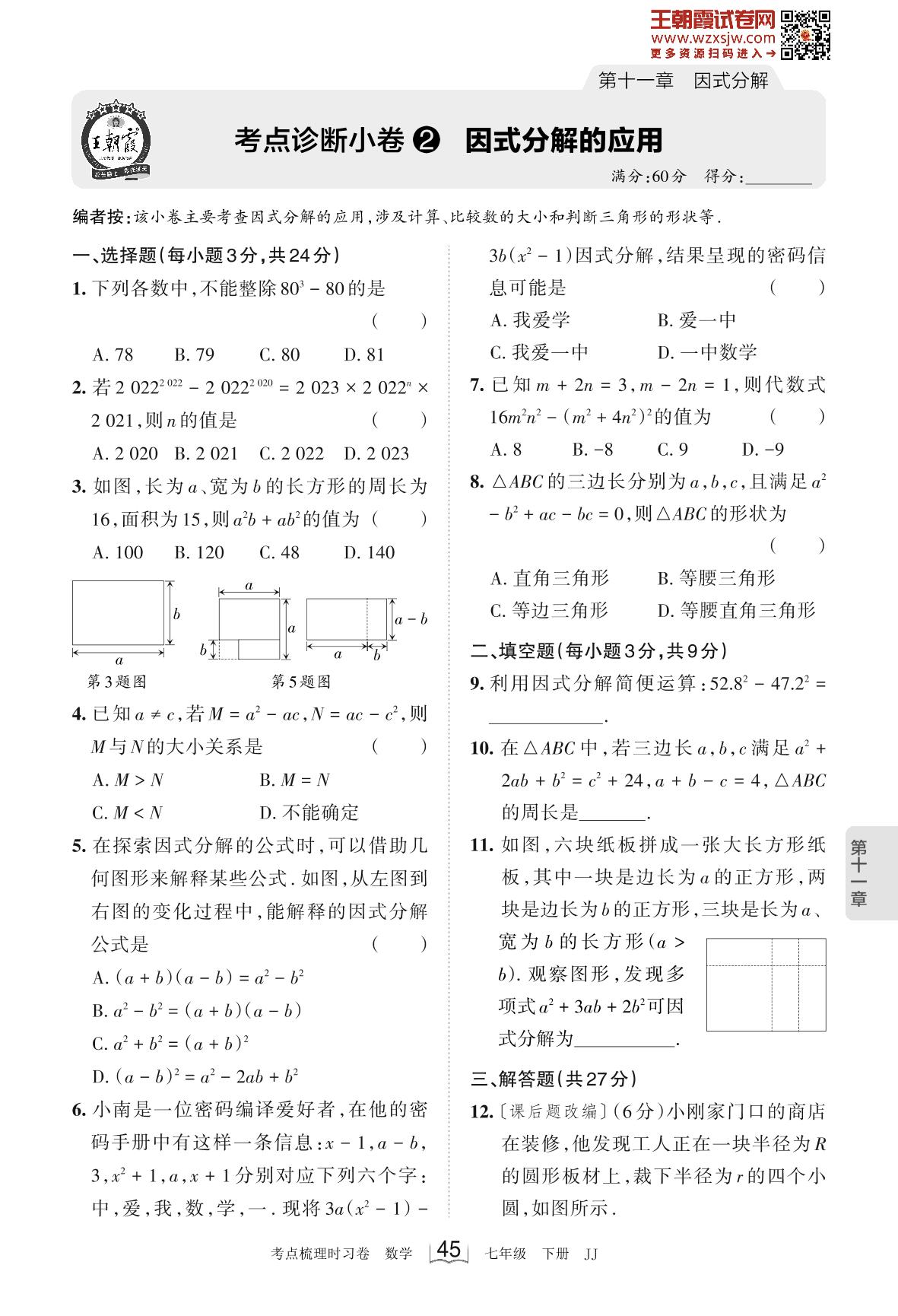 2023下册七年级数学冀教版 第十一章 考点诊断小卷2 因式分解的应用