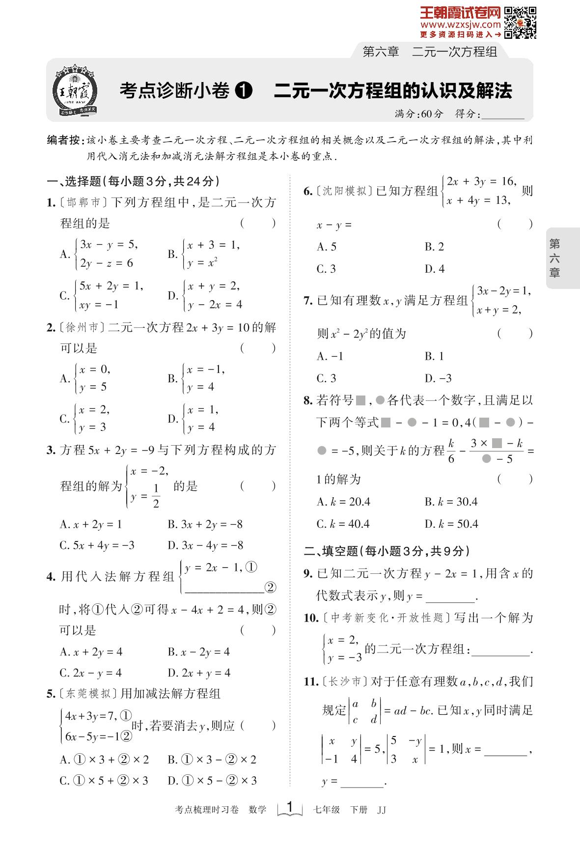 2023下册七年级数学冀教版 第六章 考点诊断小卷1 二元一次方程组的认识及解法