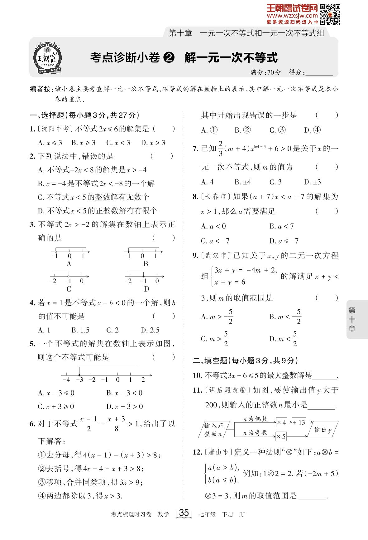 2023下册七年级数学冀教版 第十章 考点诊断小卷2 解一元一次不等式