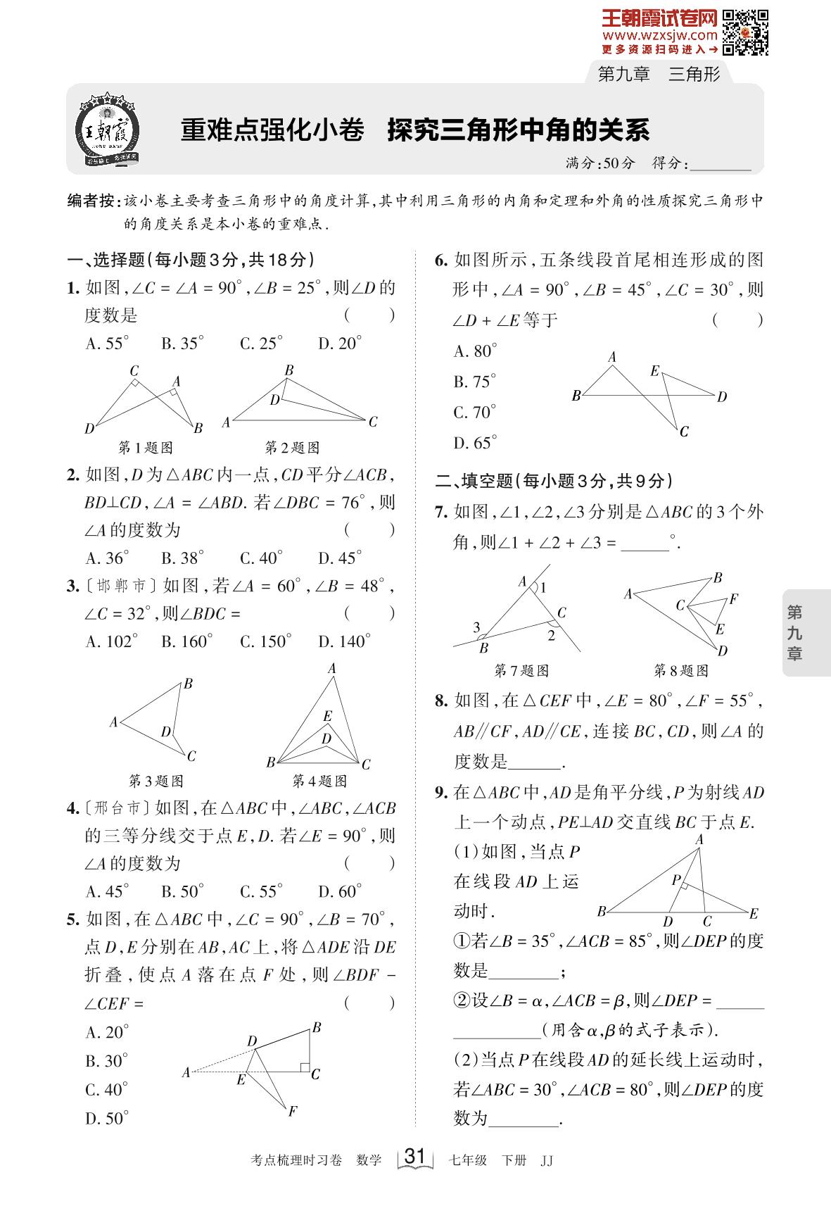 2023下册七年级数学冀教版 第九章 重难点强化小卷 探究三角形中角的关系