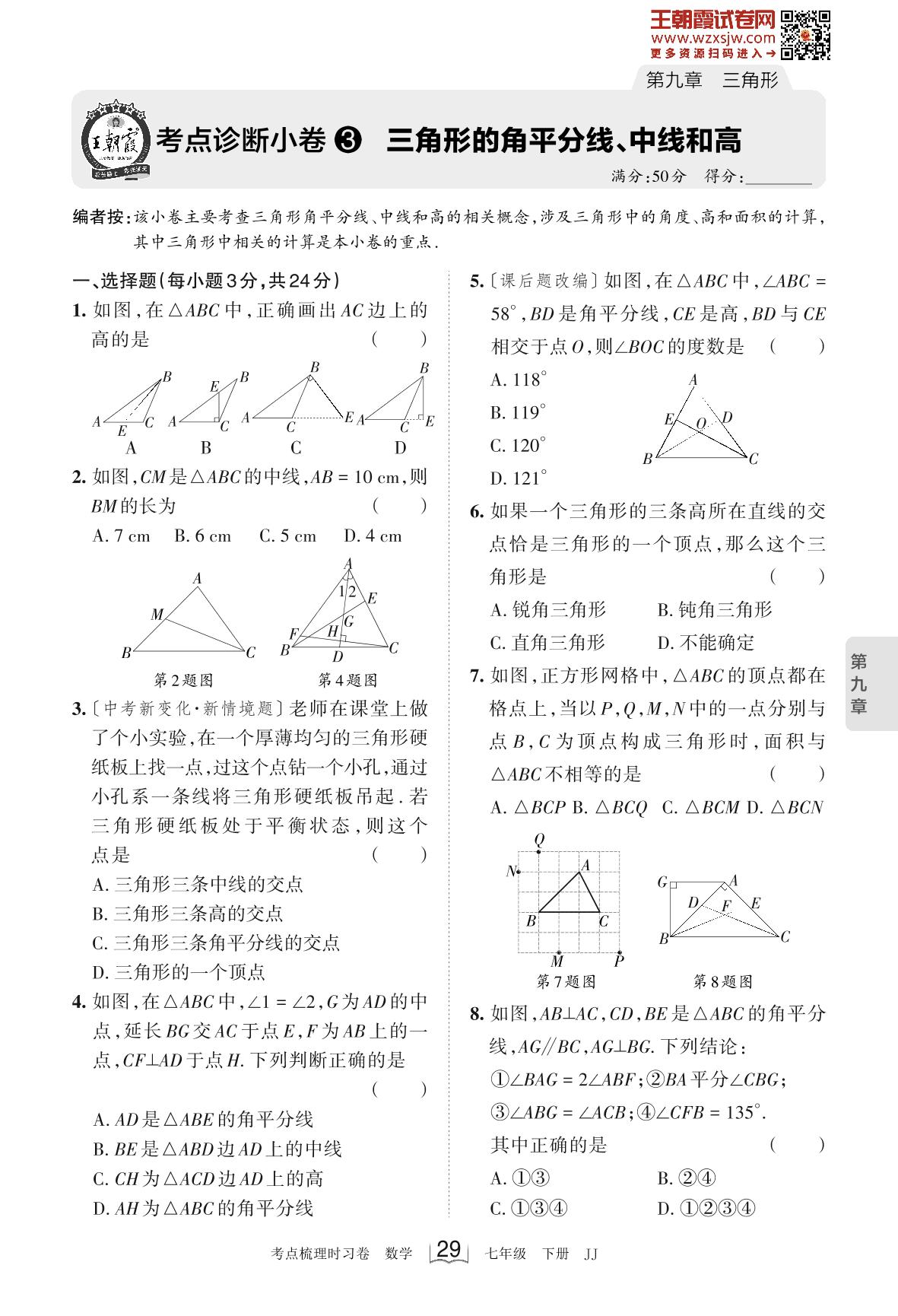 2023下册七年级数学冀教版 第九章 考点诊断小卷3 三角形的角平分线、中线和高