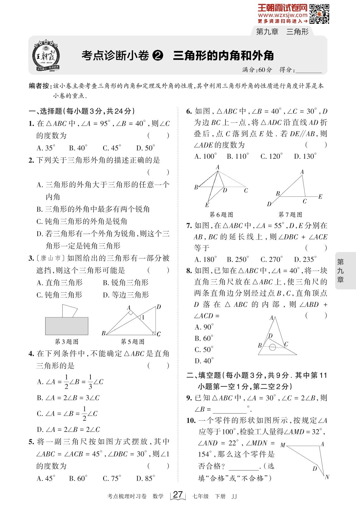 2023下册七年级数学冀教版 第九章 考点诊断小卷2 三角形的内角和外角