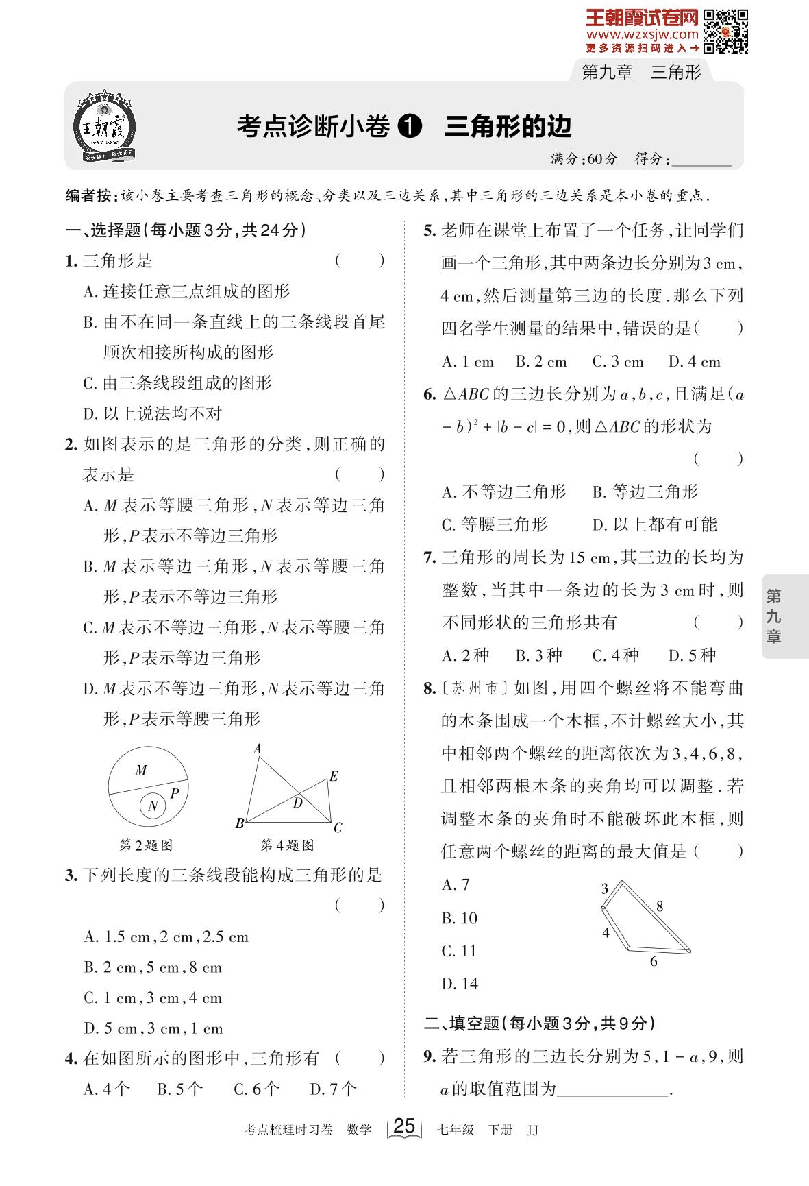 2023下册七年级数学冀教版 第九章 考点诊断小卷1 三角形的边