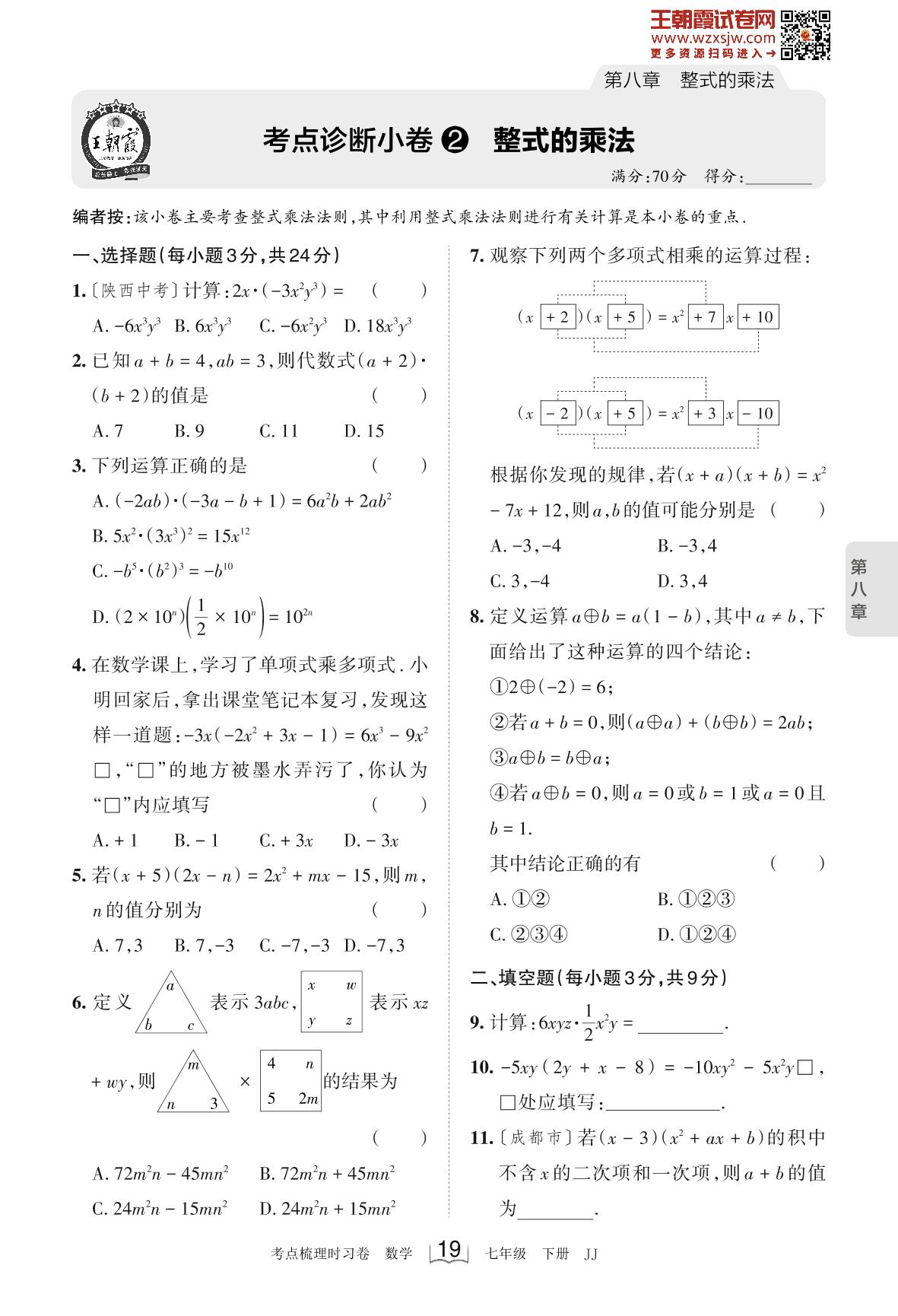 2023下册七年级数学冀教版 第八章 考点诊断小卷2 整式的乘法