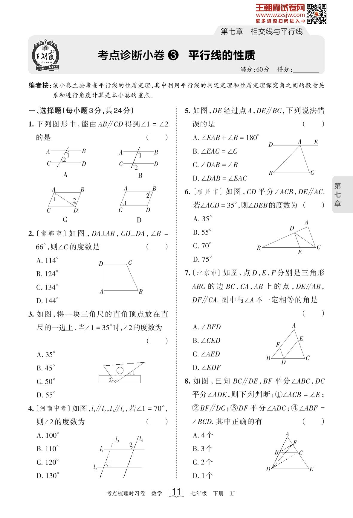 2023下册七年级数学冀教版 第七章 考点诊断小卷3 平行线的性质