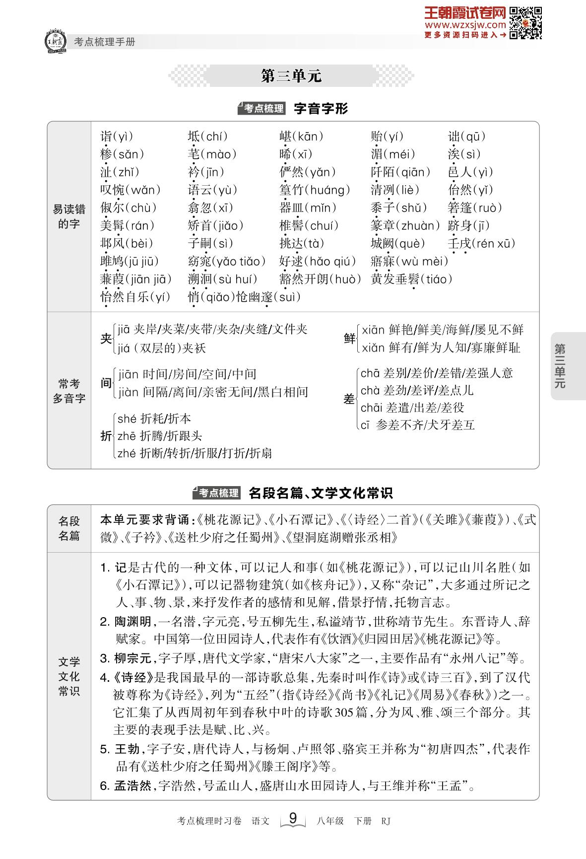 2023下册八年级语文人教版 考点梳理手册——第三单元