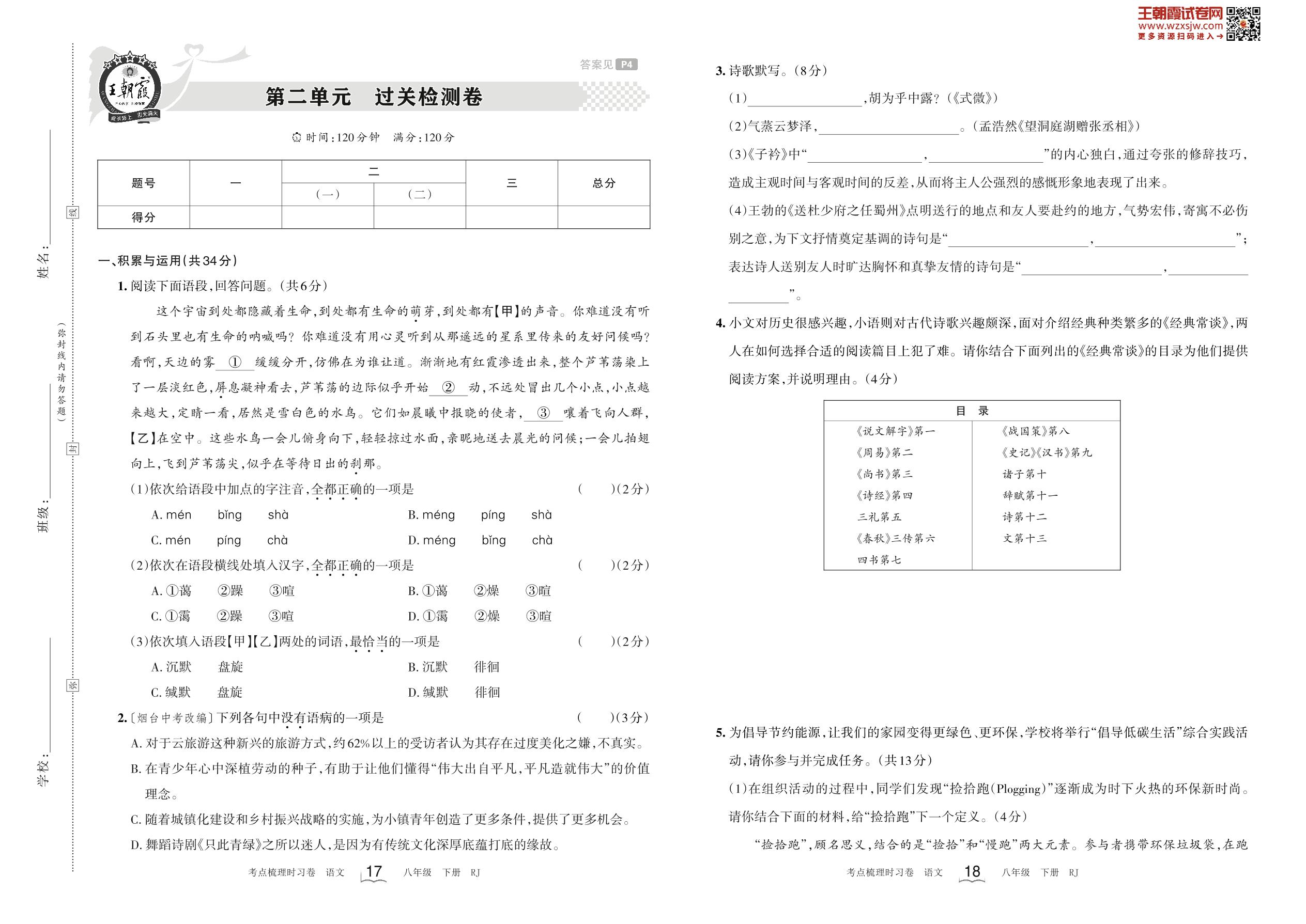 2023下册八年级语文人教版 第二单元 过关检测卷