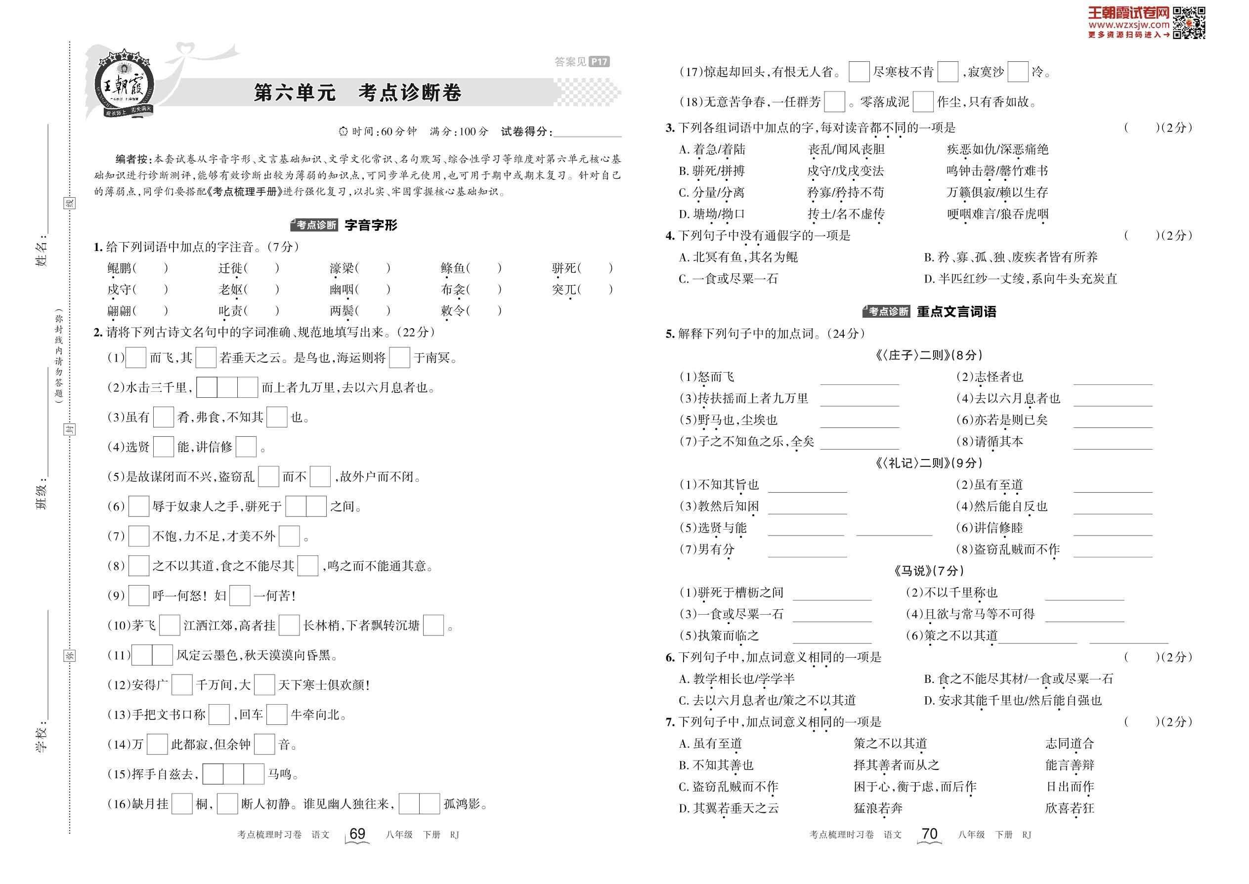 2023下册八年级语文人教版 第六单元 考点诊断卷