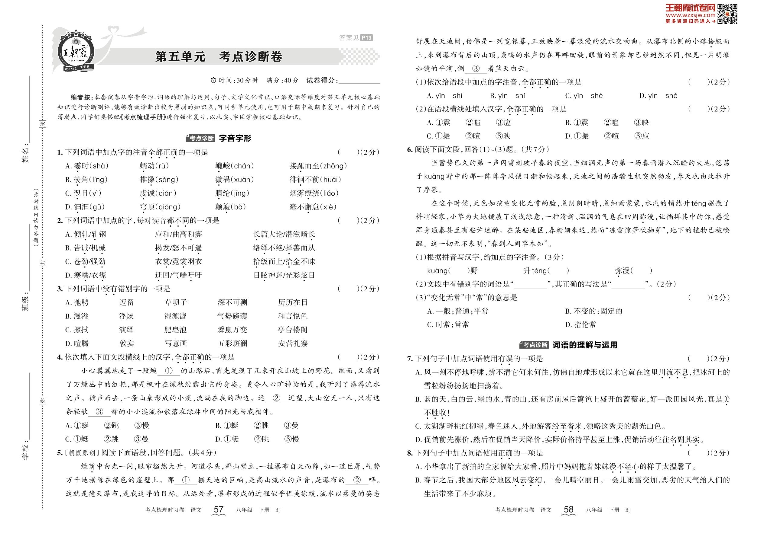 2023下册八年级语文人教版 第五单元 考点诊断卷