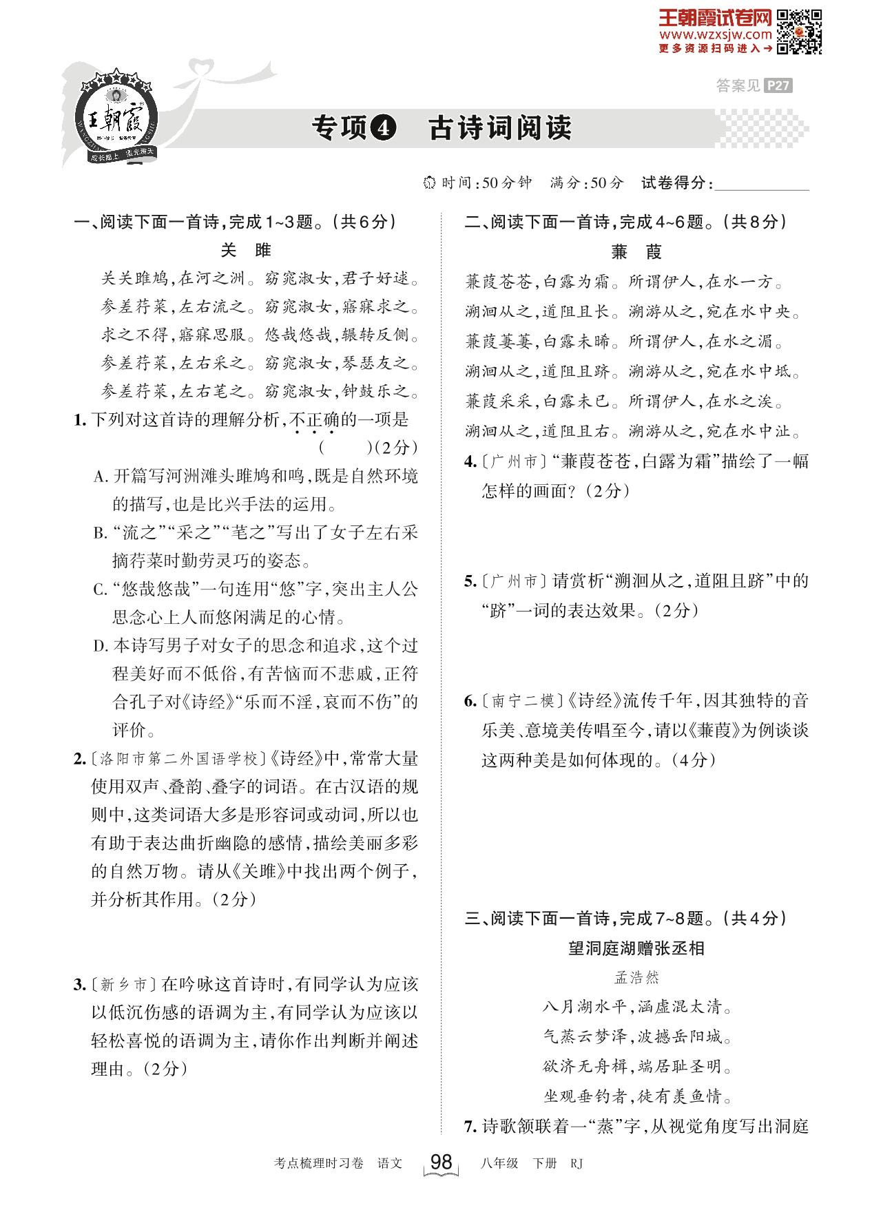 2023下册八年级语文人教版 专项4 古诗词阅读