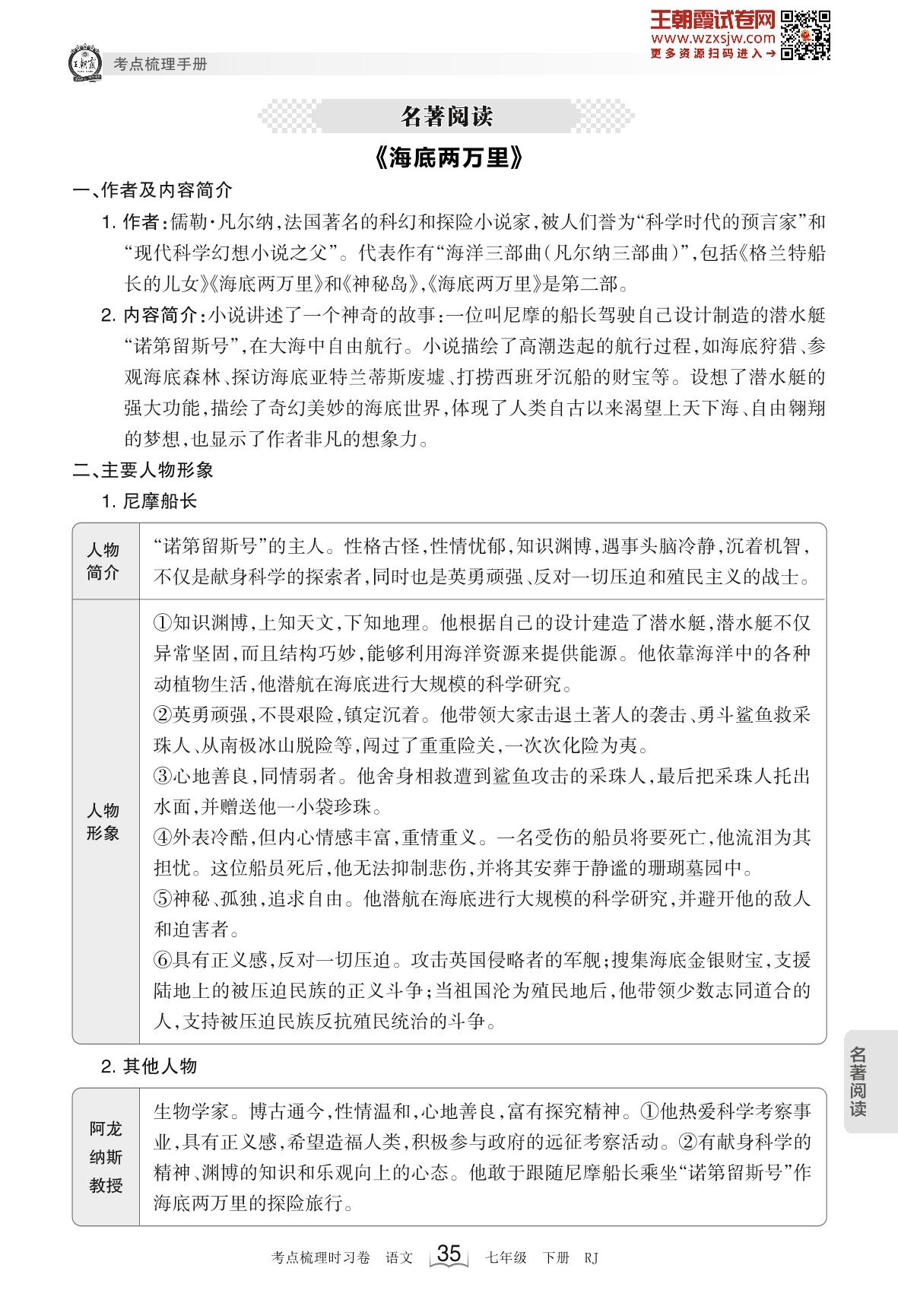 2023下册七年级语文人教版 考点梳理手册——名著阅读《海底两万里》