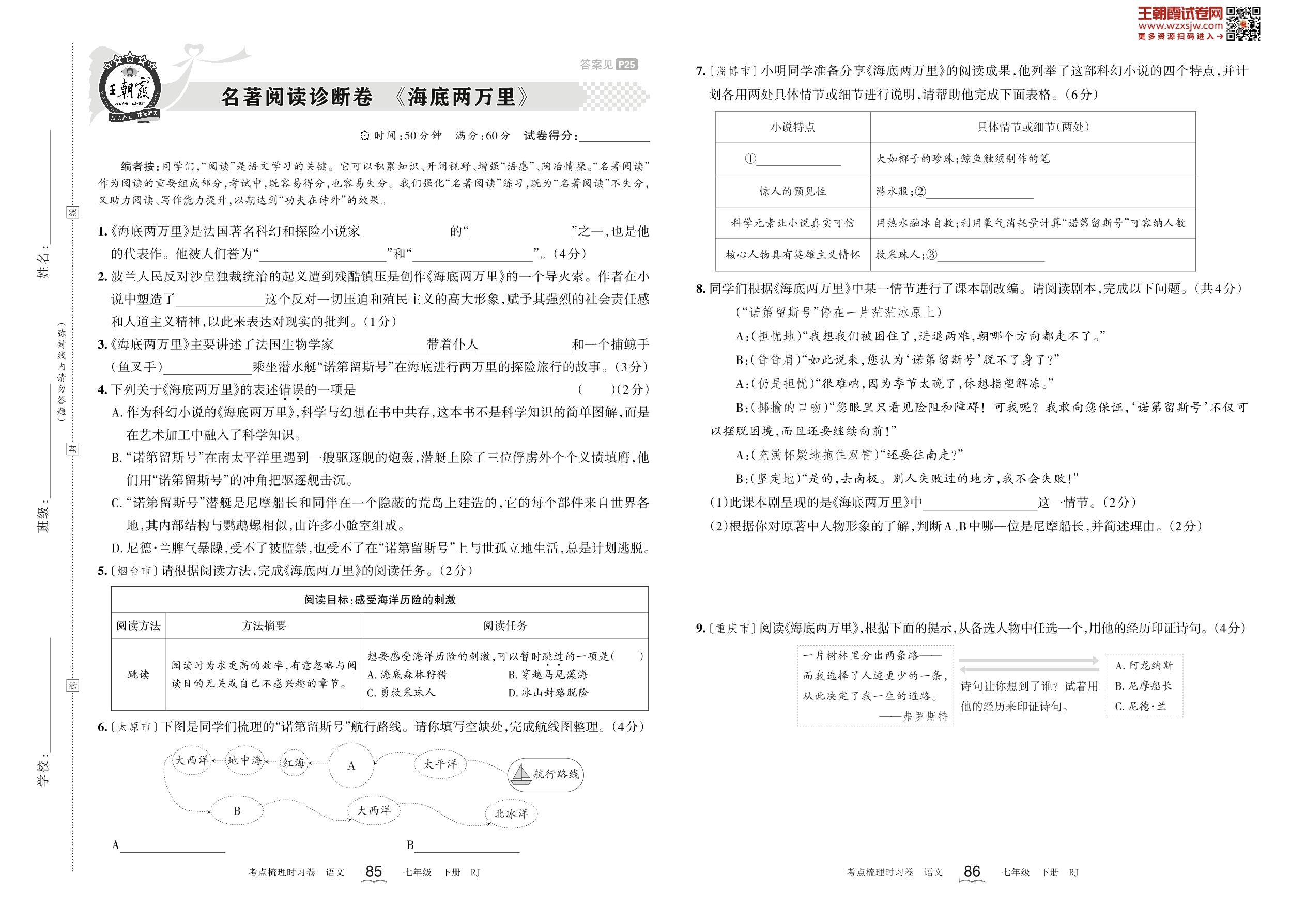 2023下册七年级语文人教版 名著阅读诊断卷 《海底两万里》