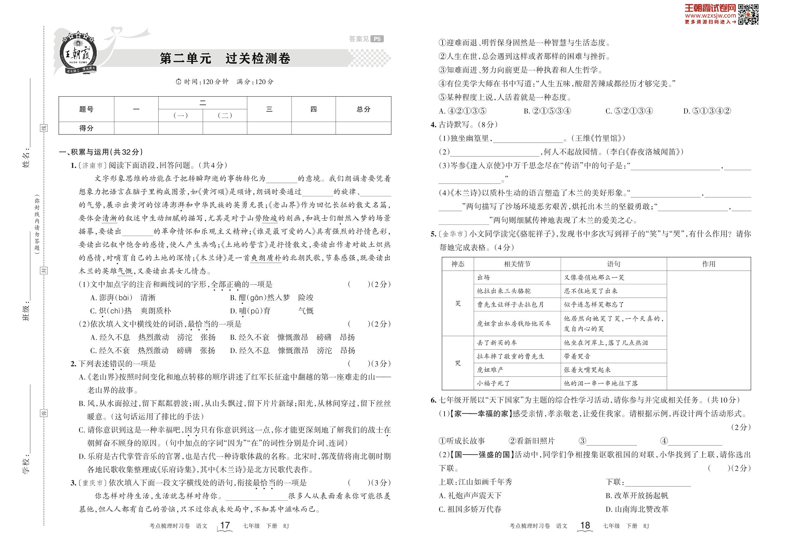 2023下册七年级语文人教版 第二单元 过关检测卷