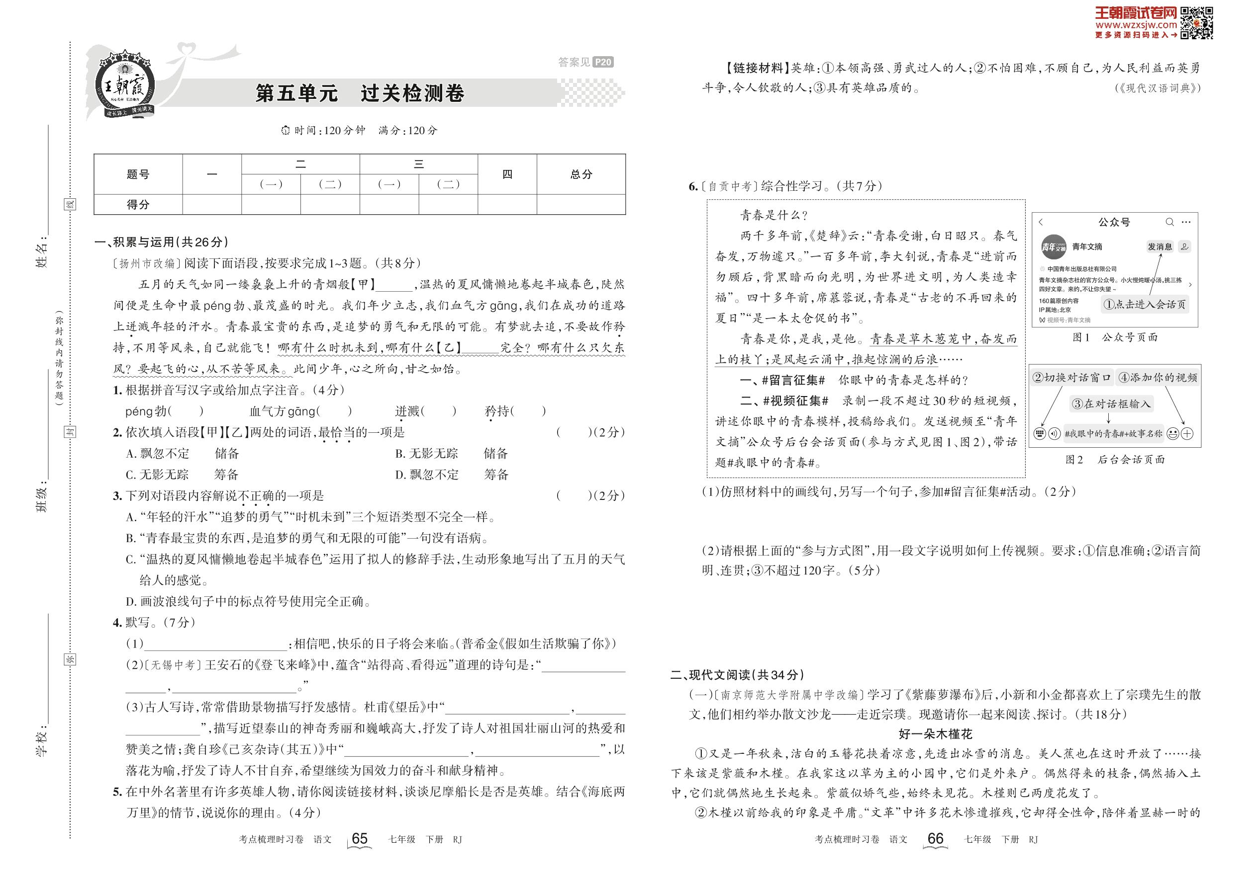 2023下册七年级语文人教版 第五单元 过关检测卷
