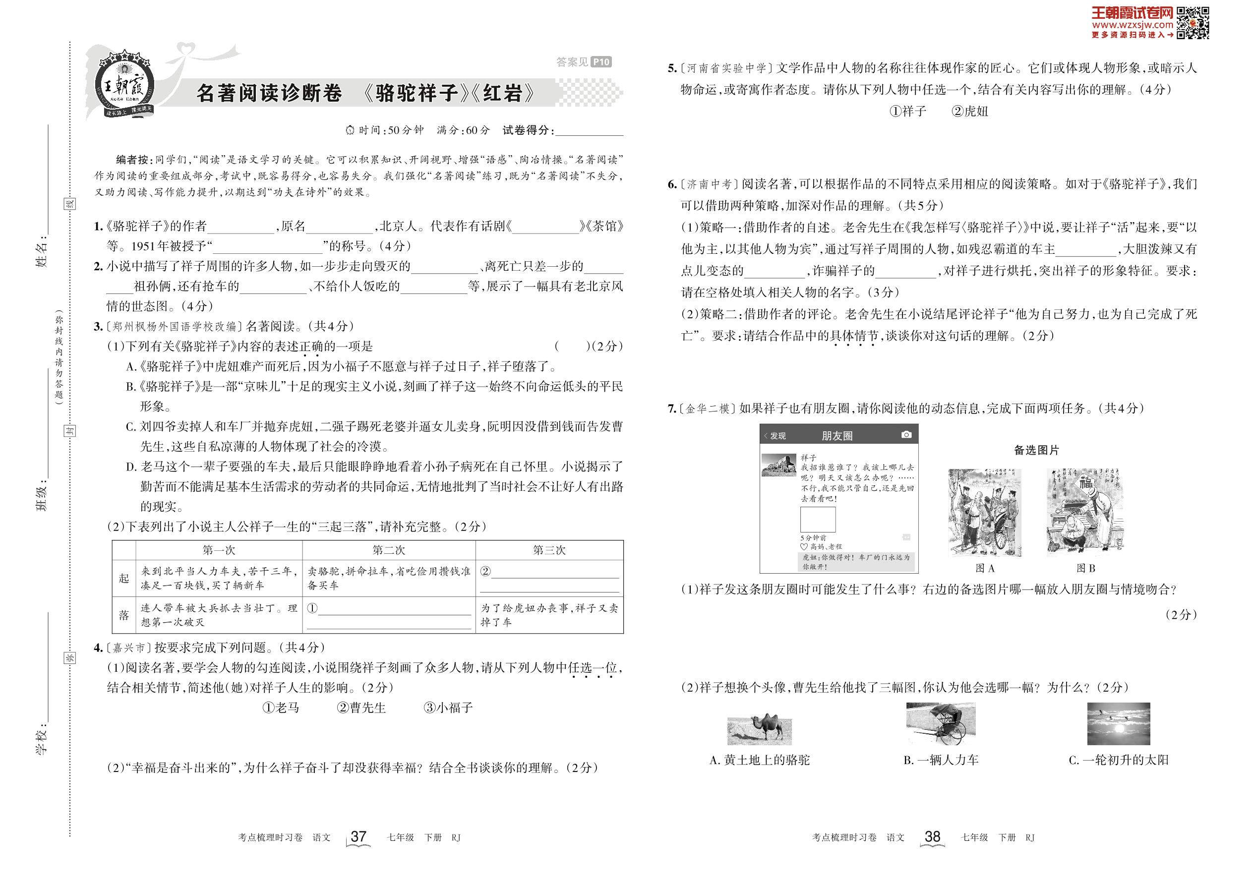 2023下册七年级语文人教版 名著阅读诊断卷 《骆驼祥子》《红岩》