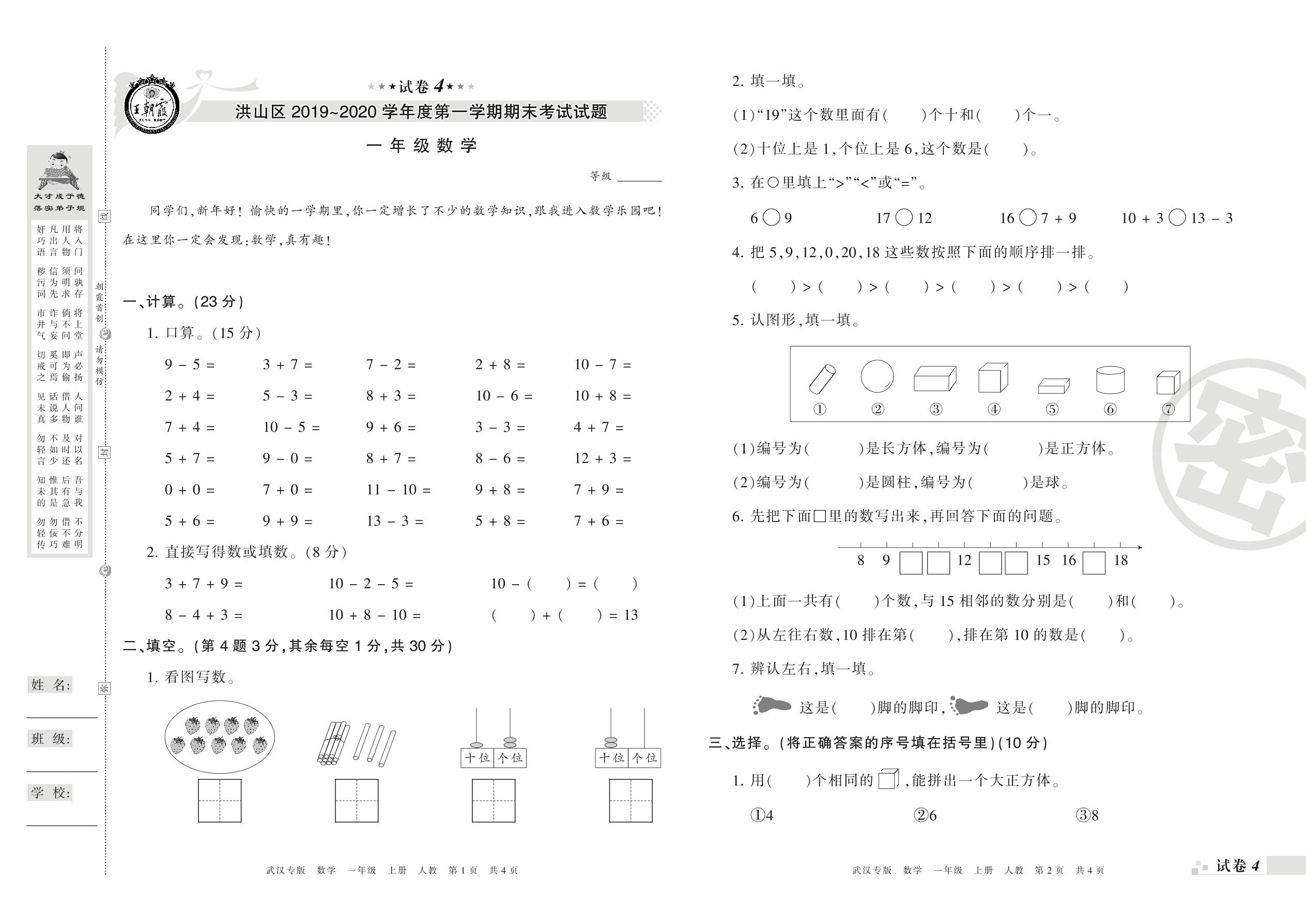 2019-2020学年第一学期武汉市洪山区一年级数学试卷(人教版)【4】