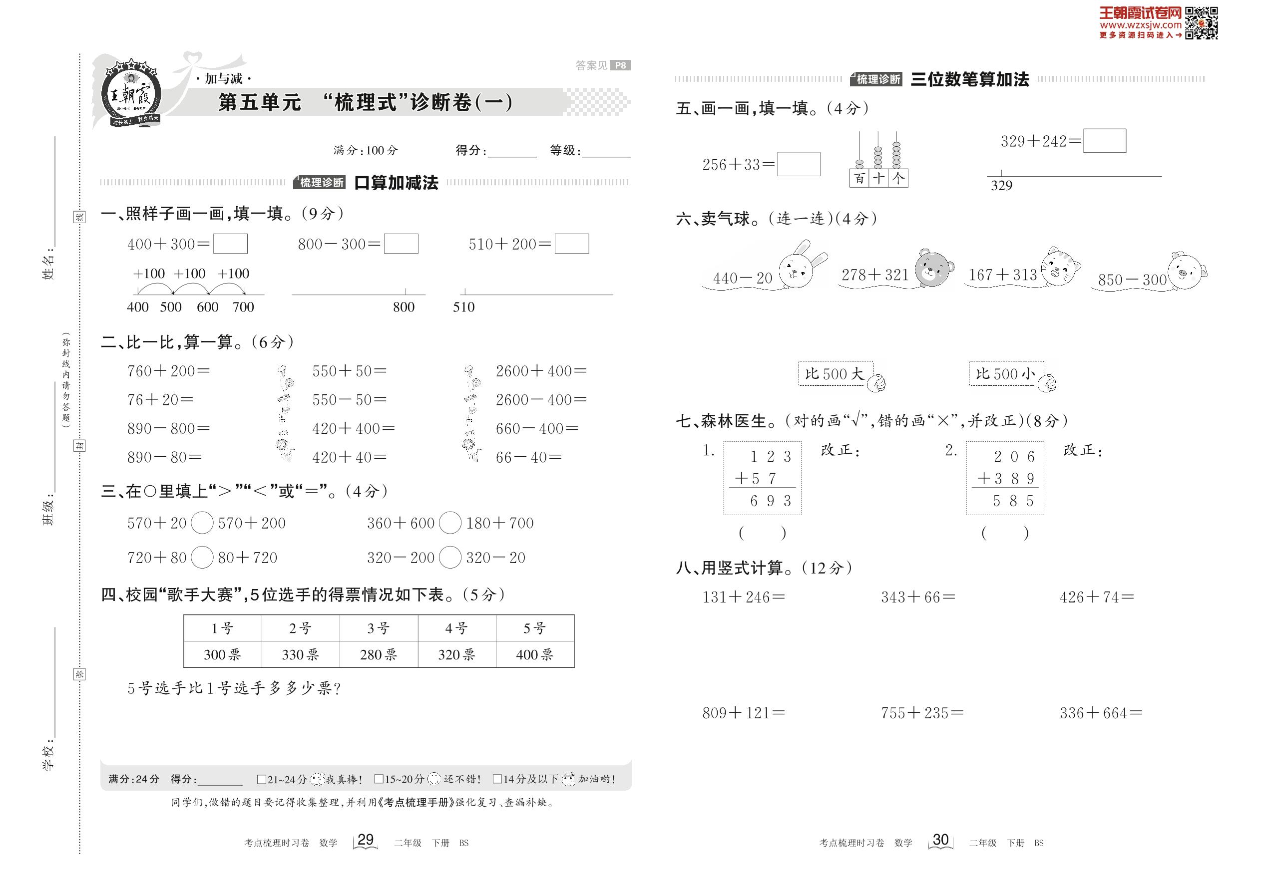 2023下册二年级数学北师版 第五单元 “梳理式”诊断卷(一)