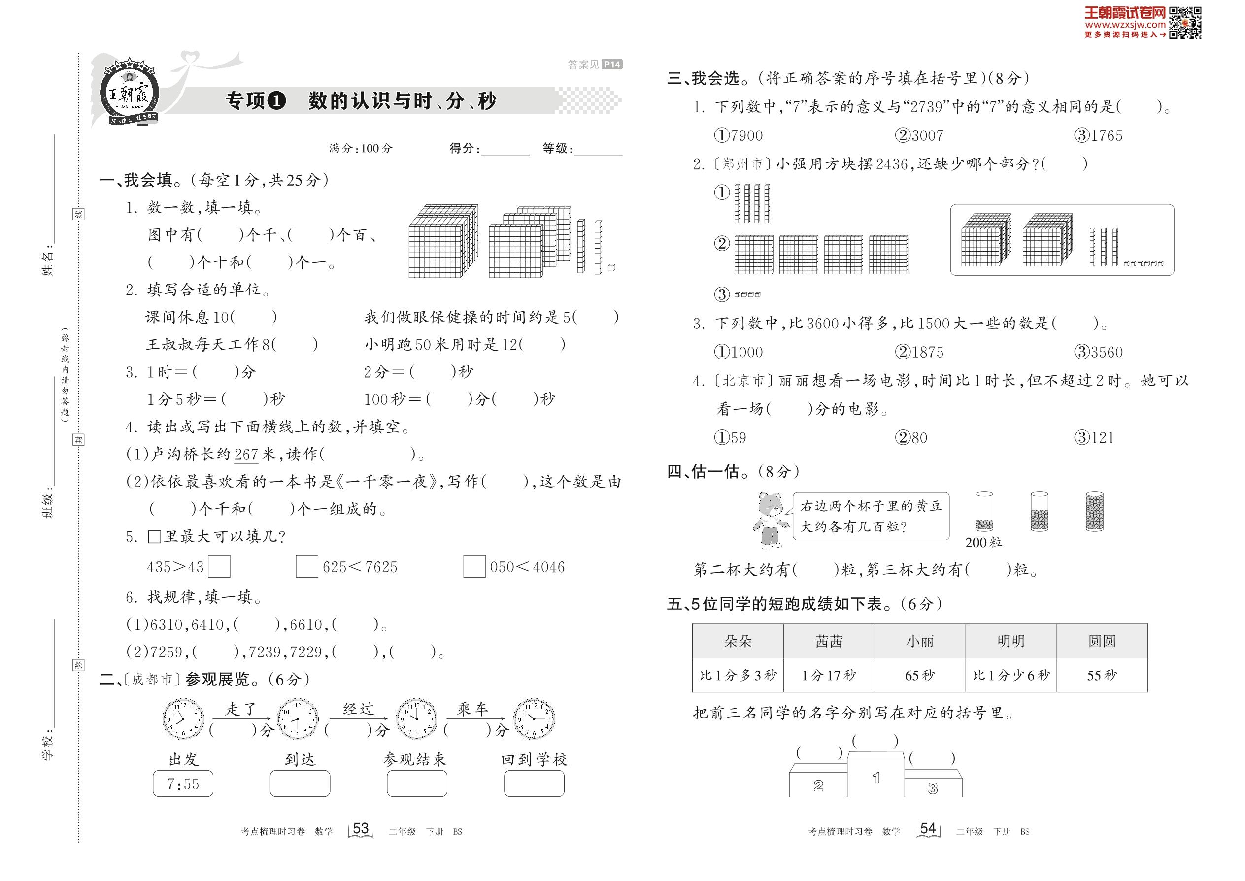 2023下册二年级数学北师版 专项1 数的认识与时、分、秒