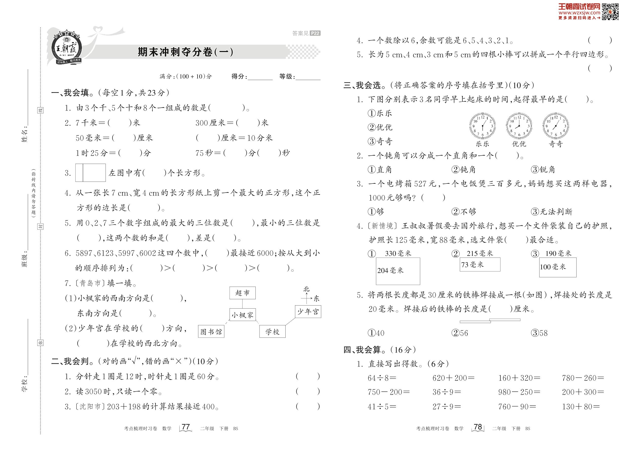 2023下册二年级数学北师版 期末冲刺夺分卷(一)
