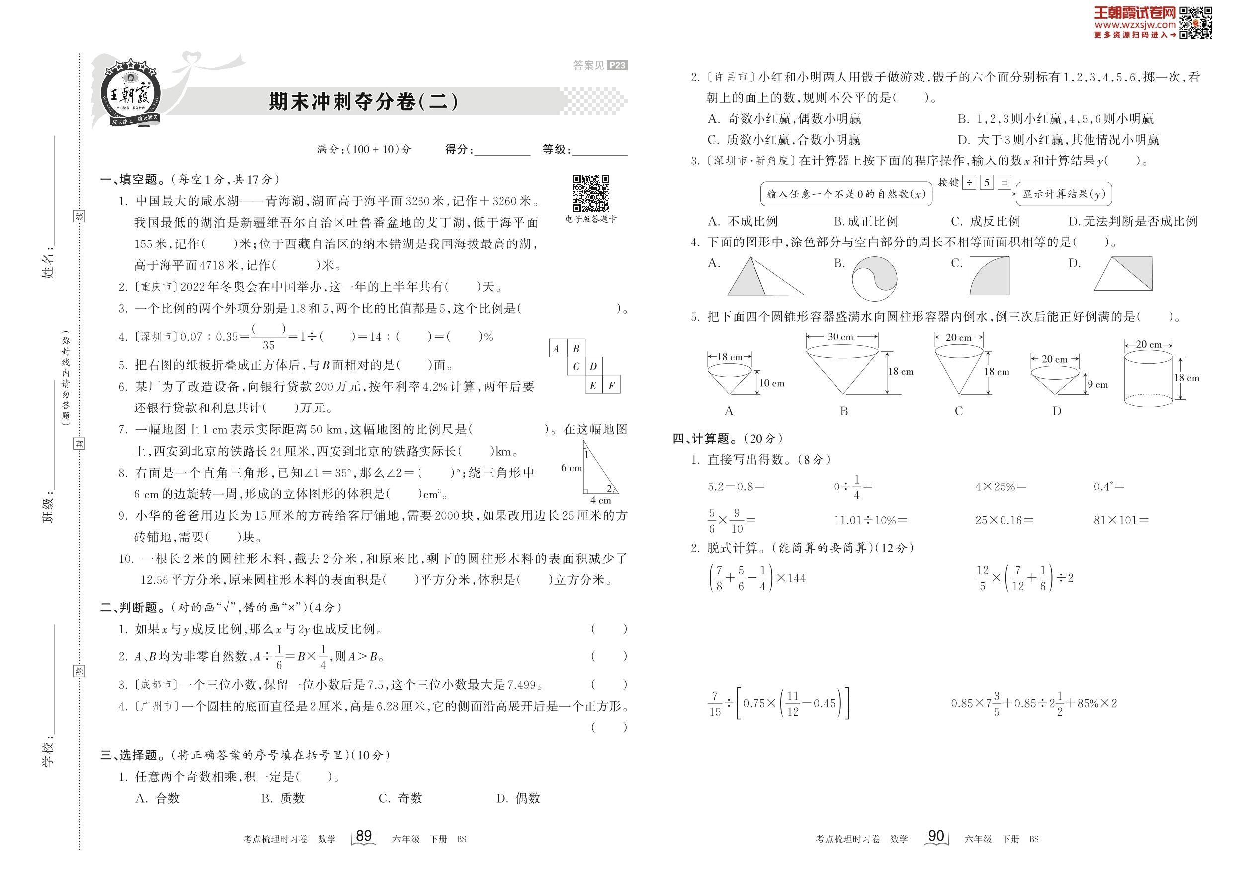 2023下册六年级数学北师版 期末冲刺夺分卷(二)