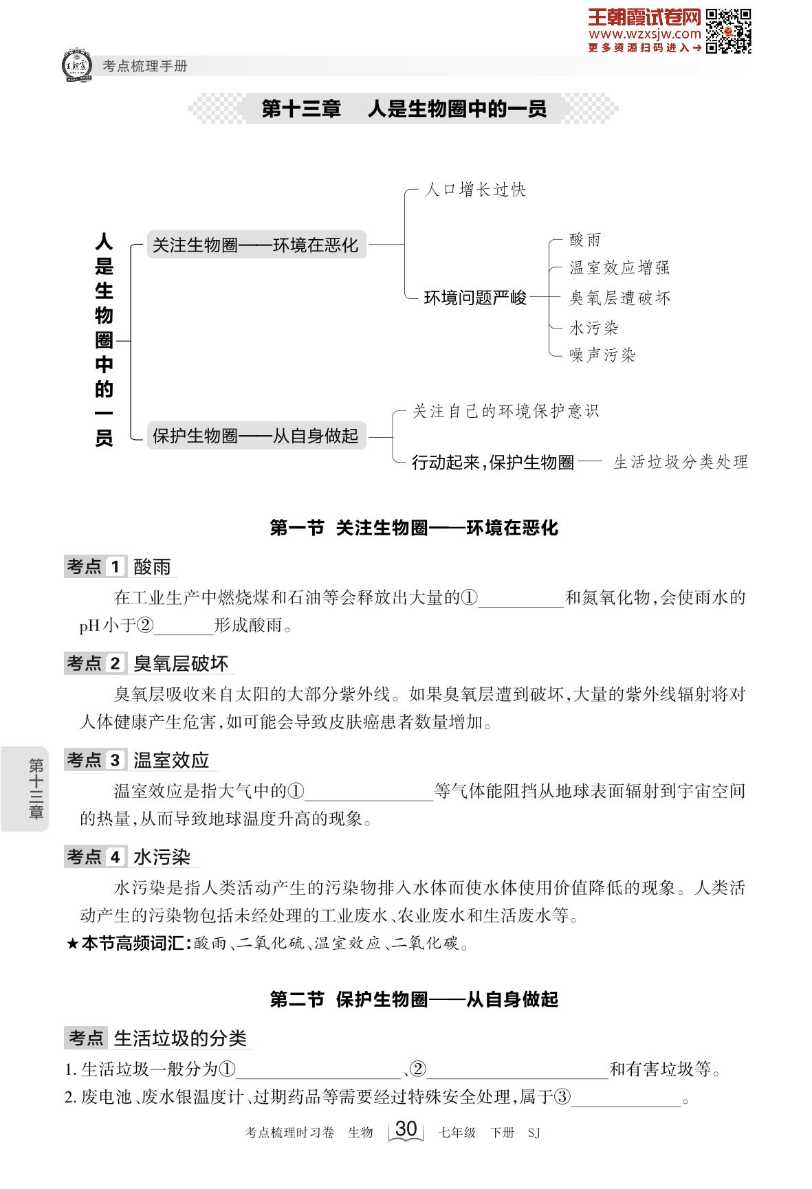 2023下册七年级生物苏教版 考点梳理手册——第十三章 人是生命圈中的一员