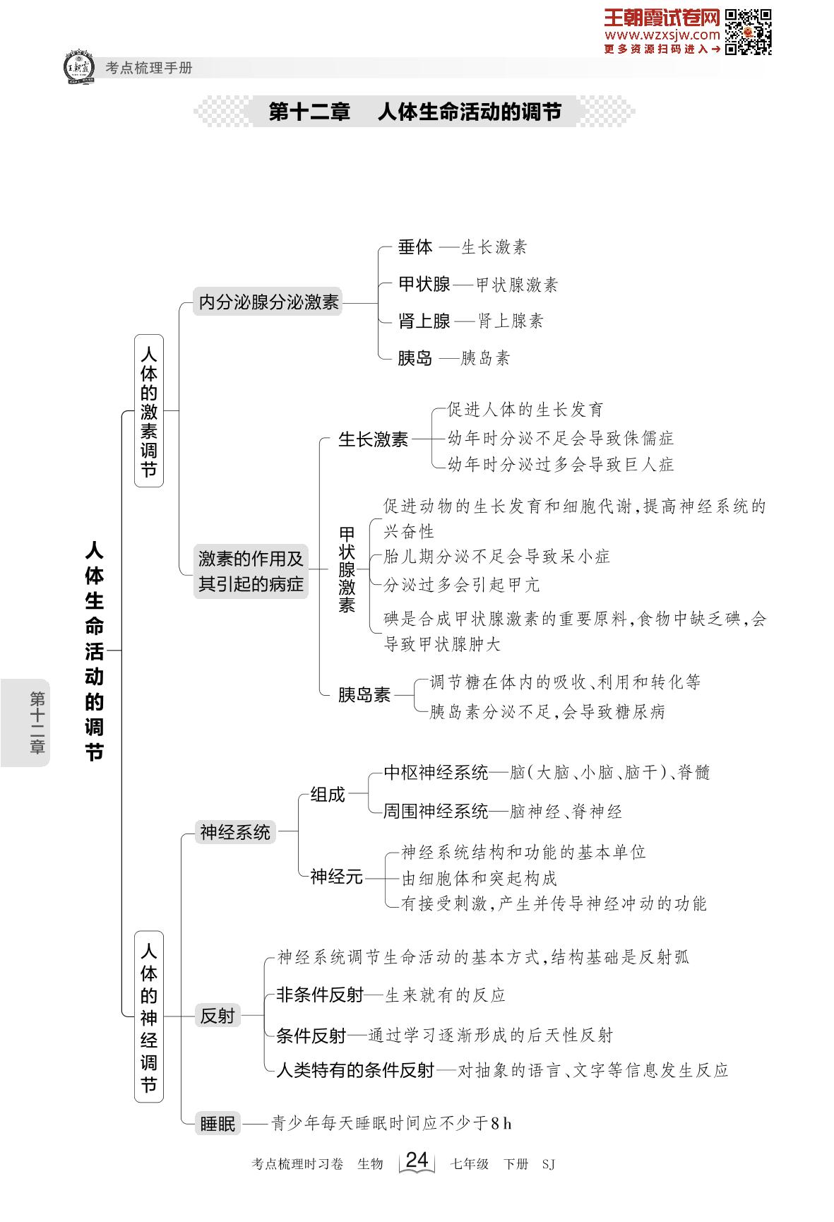 2023下册七年级生物苏教版 考点梳理手册——第十二章 人体生命活动的调节