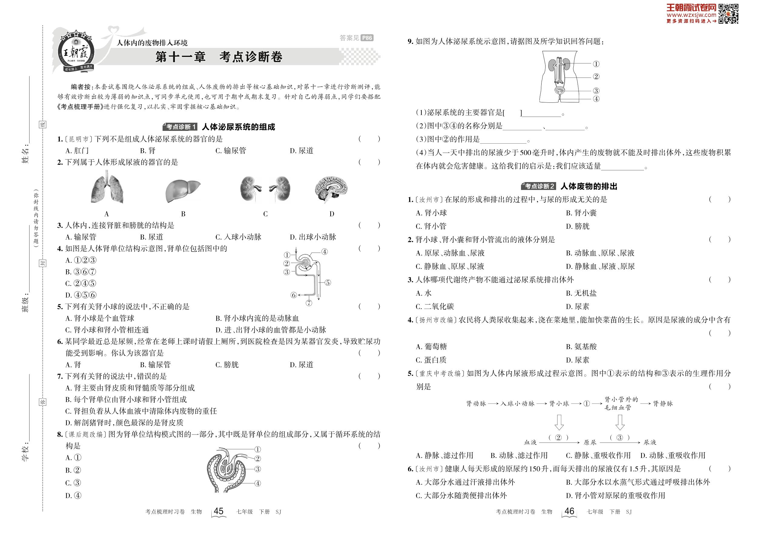 2023下册七年级生物苏教版 第十一章 考点诊断卷