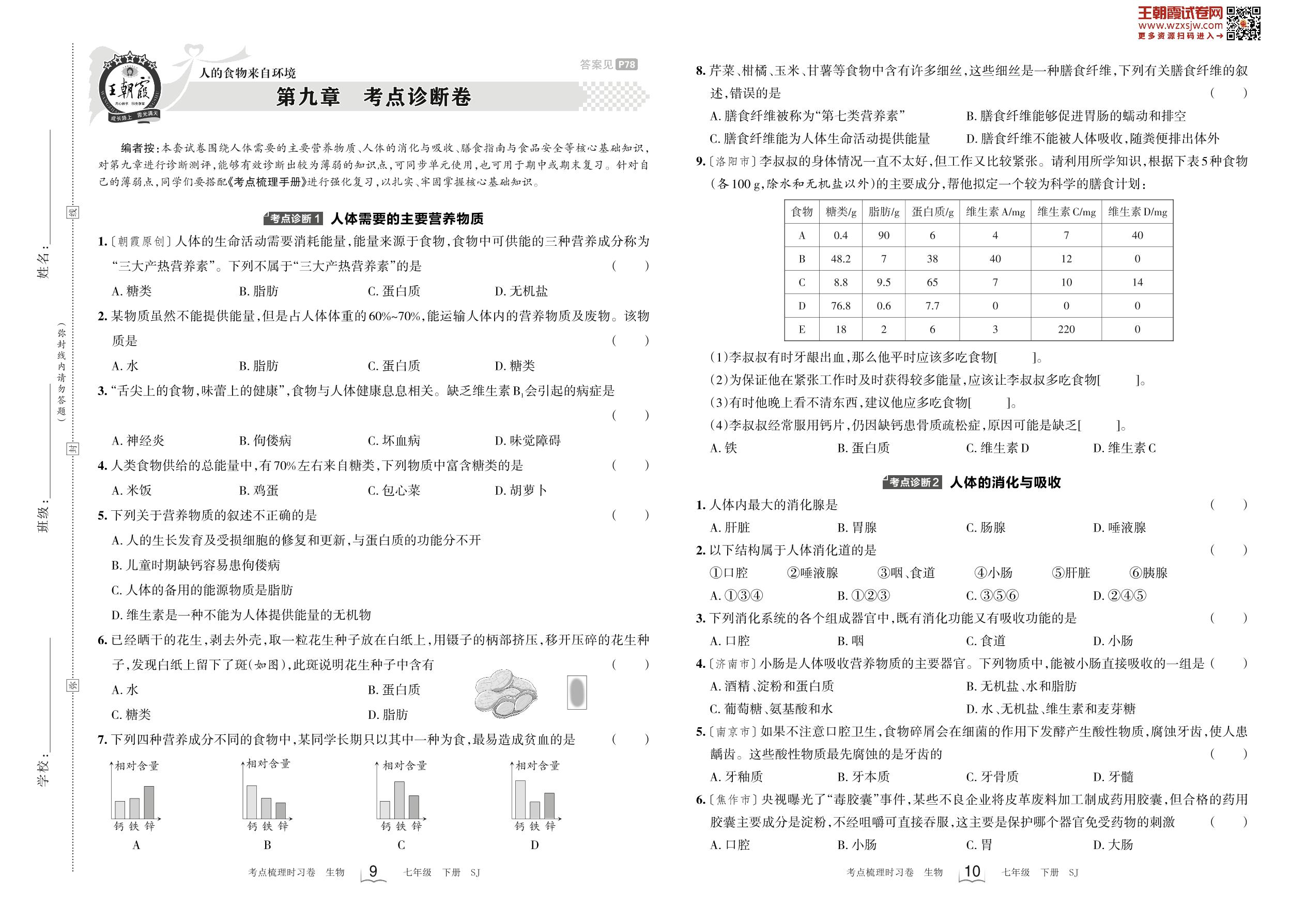 2023下册七年级生物苏教版 第九章 考点诊断卷