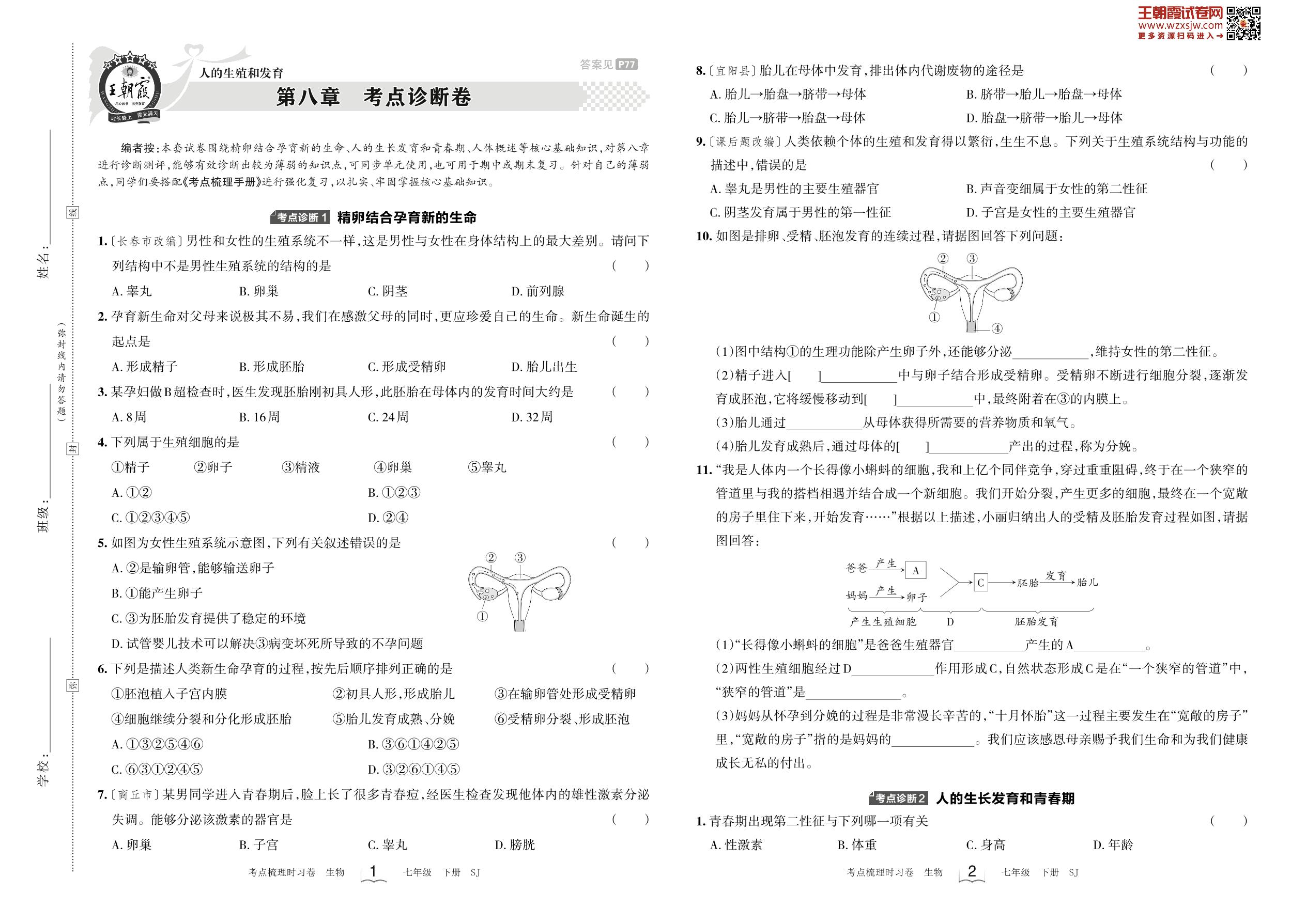 2023下册七年级生物苏教版 第八章 考点诊断卷