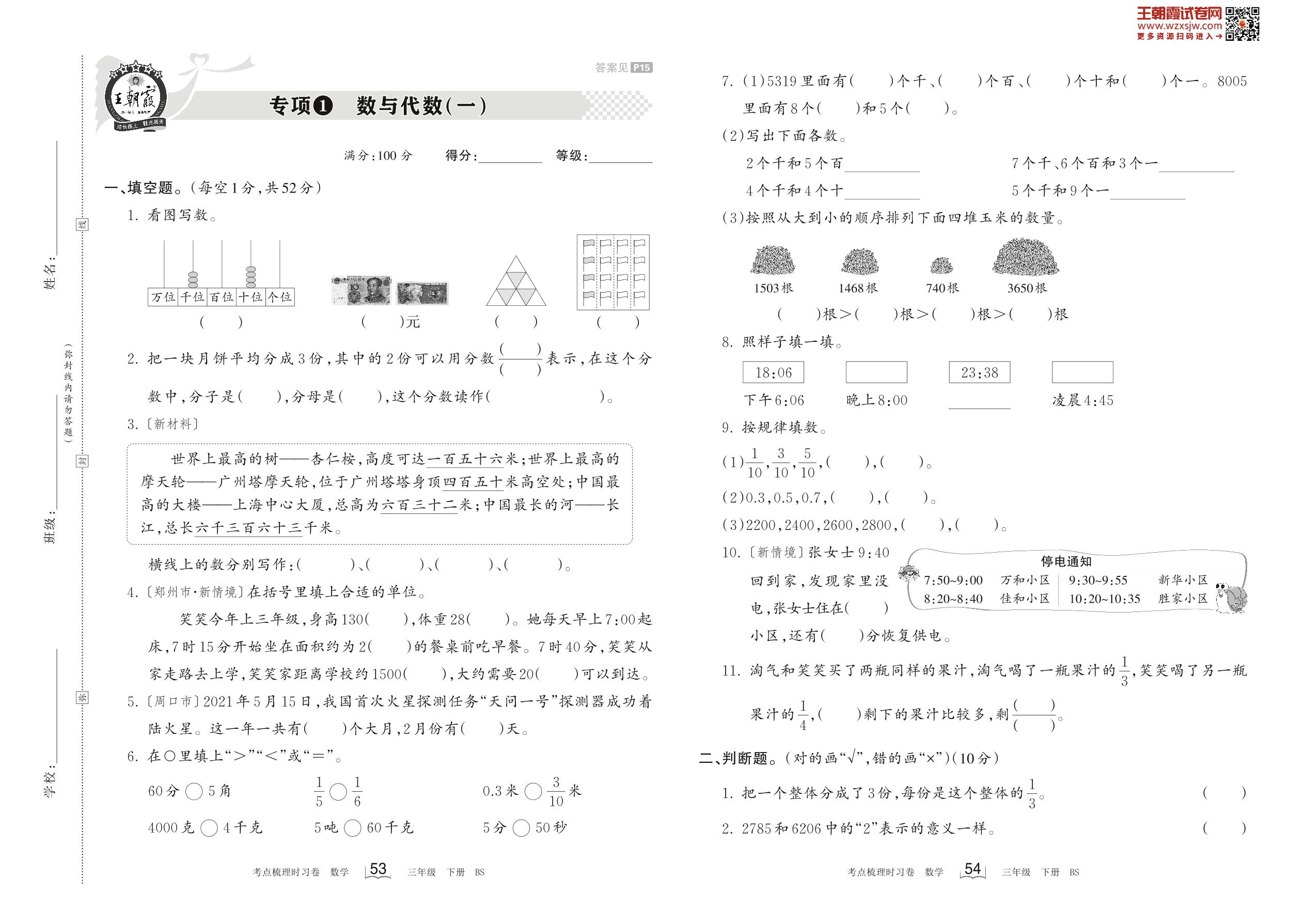 2023下册三年级数学北师版 专项1 数与代数(一)
