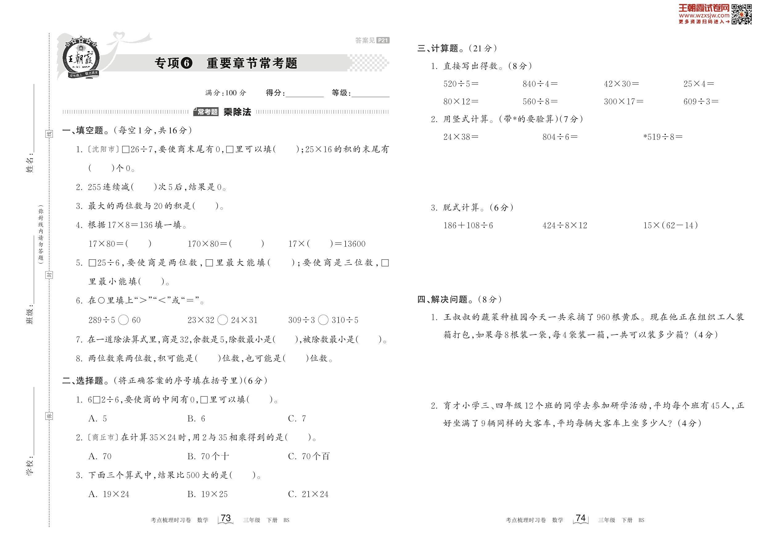 三年级数学北师版下册专项卷