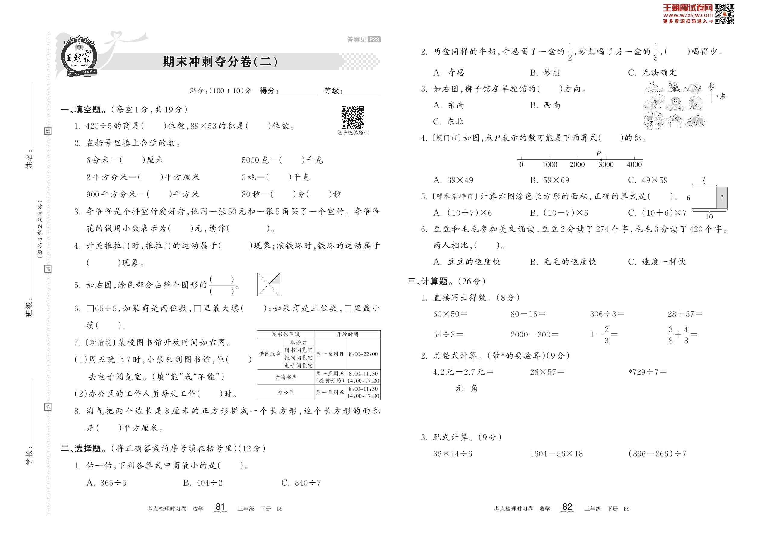 2023下册三年级数学北师版 期末冲刺夺分卷(二)