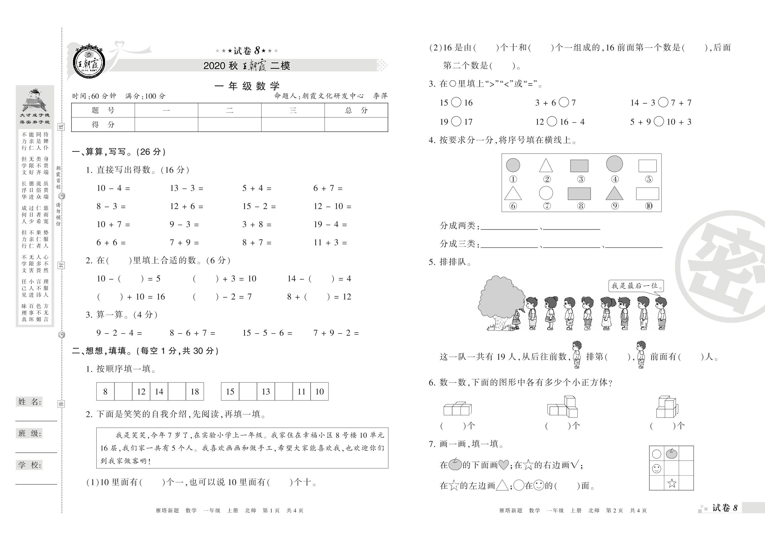 王朝霞期末模拟卷一年级上册数学(北师版)_R210802211114【8】