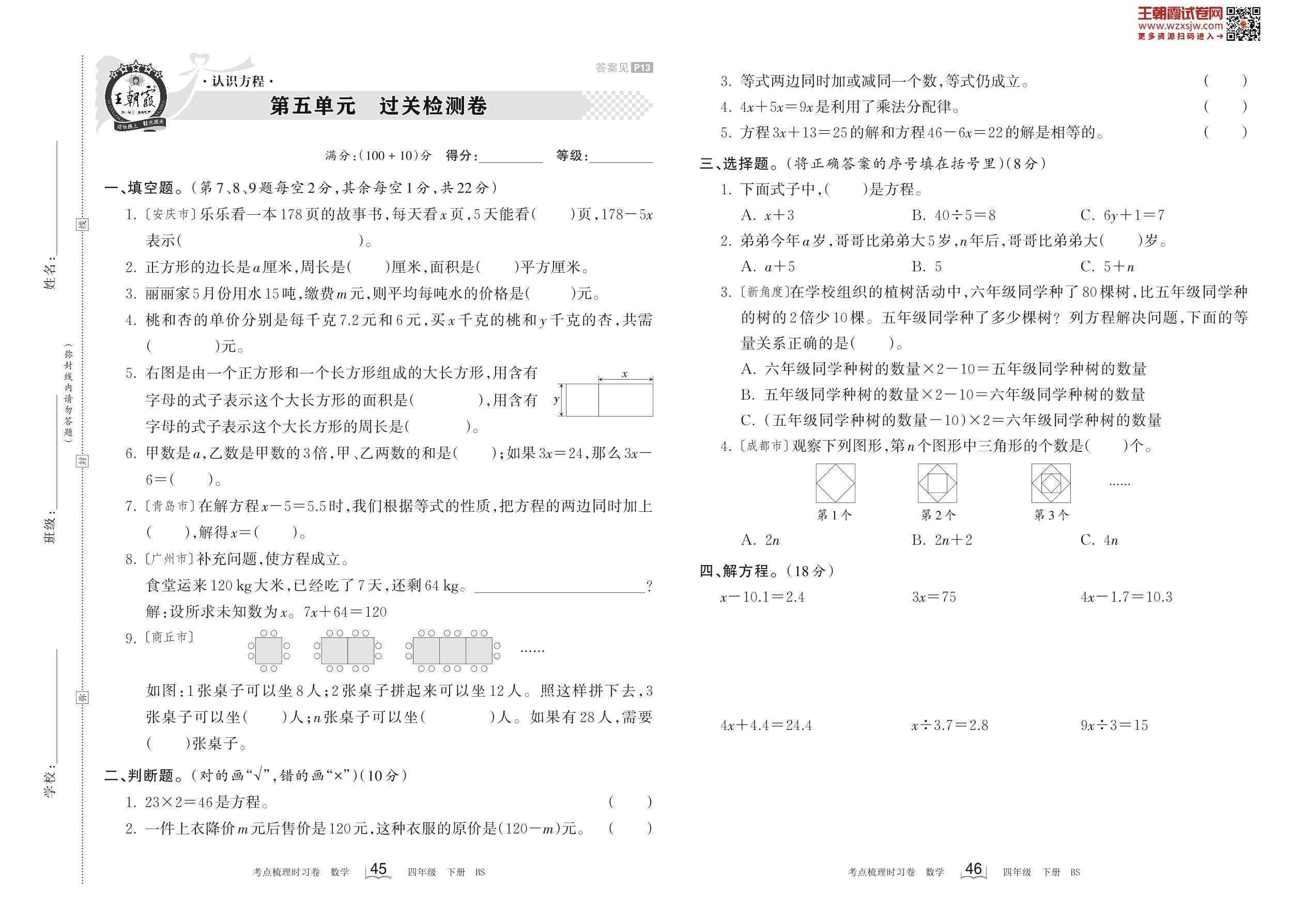 2023下册四年级数学北师版 第五单元 过关检测卷