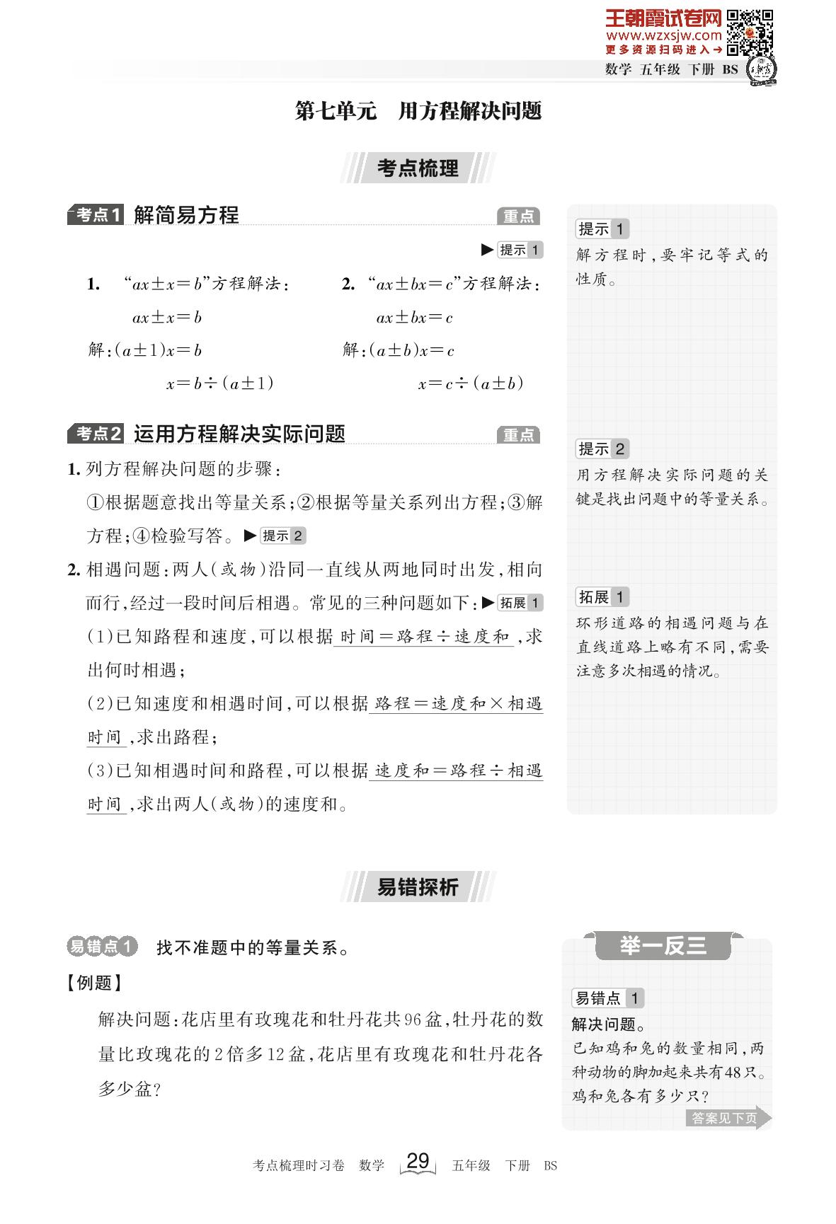 2023下册五年级数学北师版 考点梳理手册——第七单元 用方程解决问题