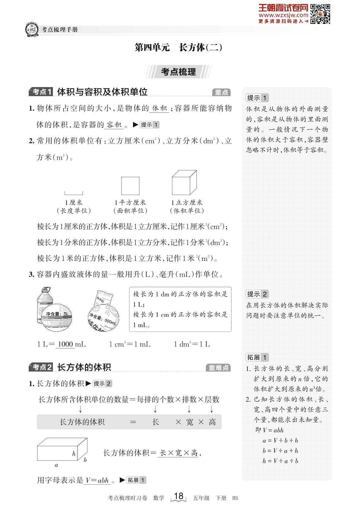 2023下册五年级数学北师版 考点梳理手册——第四单元 长方体(二)