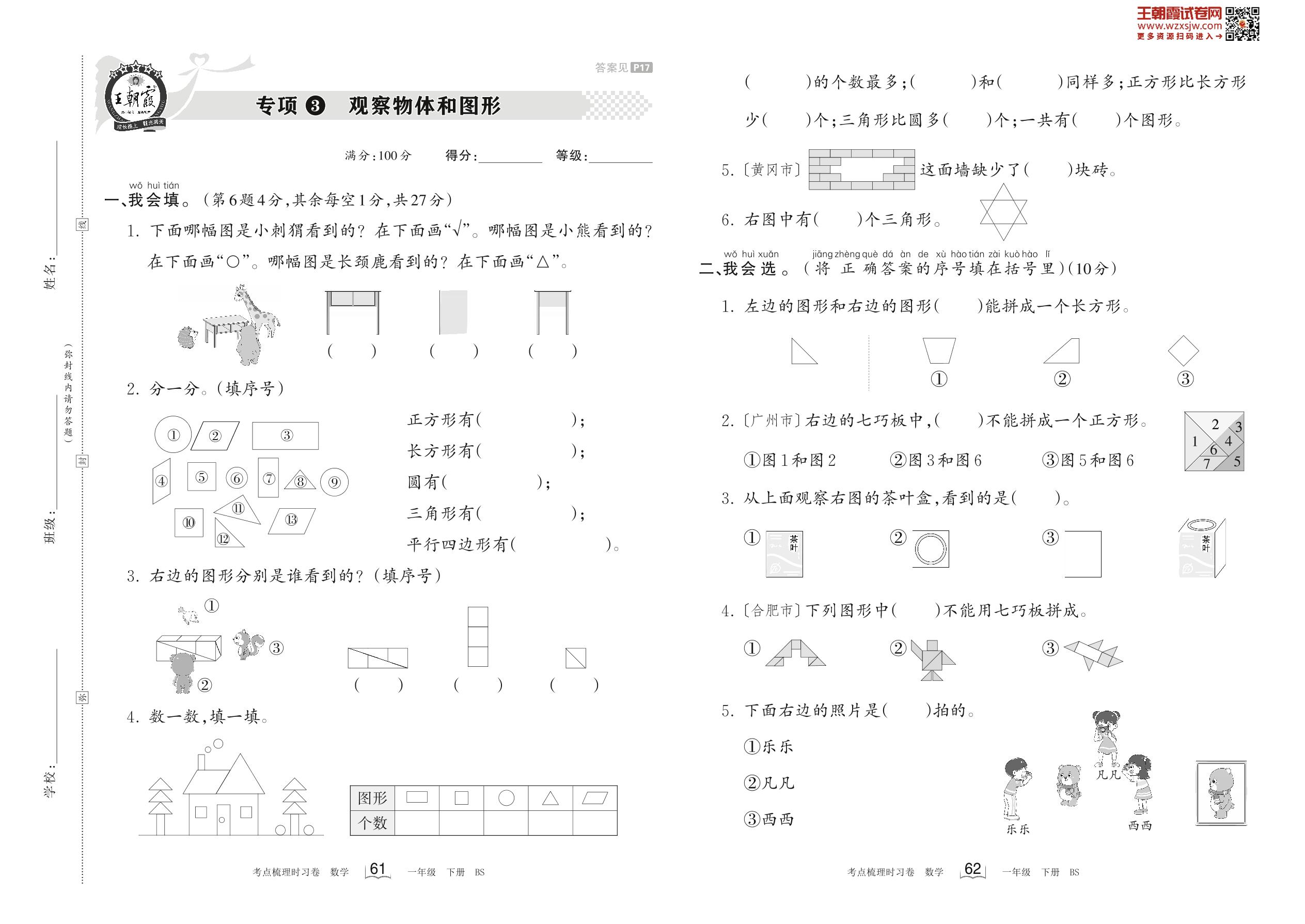 2023下册一年级数学北师版 专项3 观察物体和图形