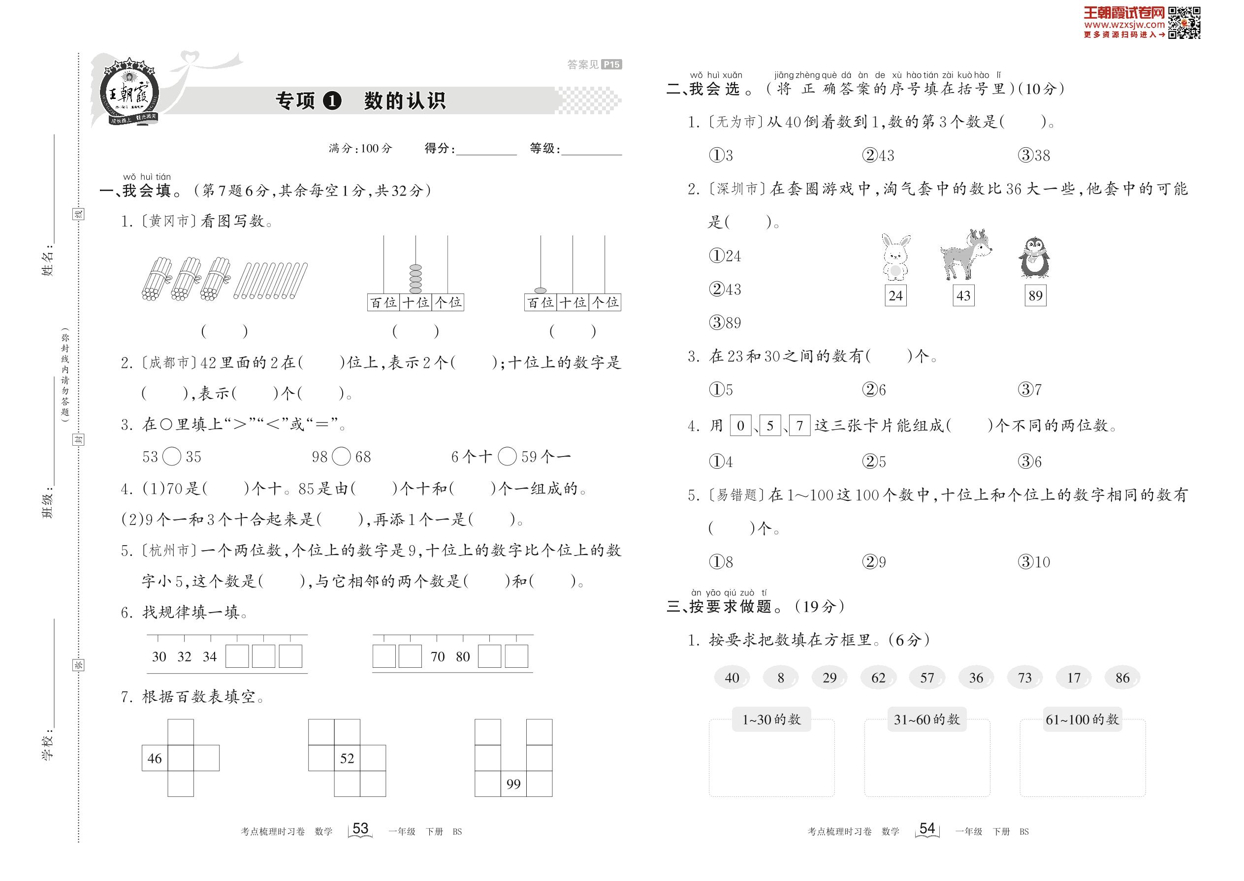 2023下册一年级数学北师版 专项1 数的认识