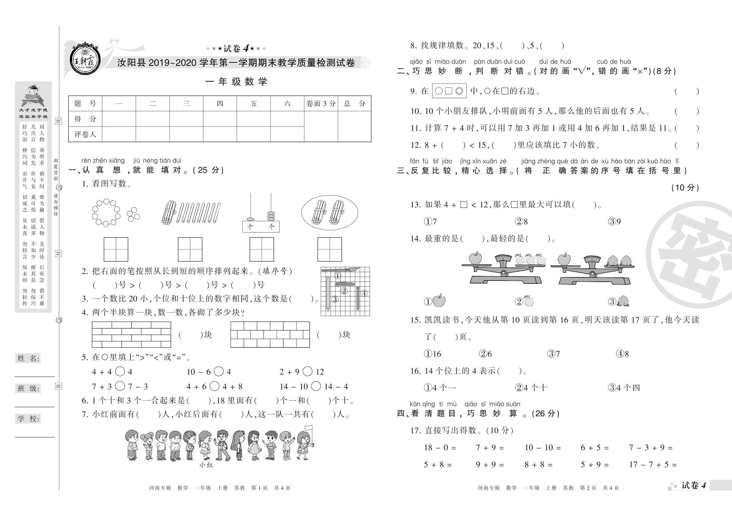 2019-2020学年第一学期洛阳市汝阳县一年级数学试卷(苏教版)【4】